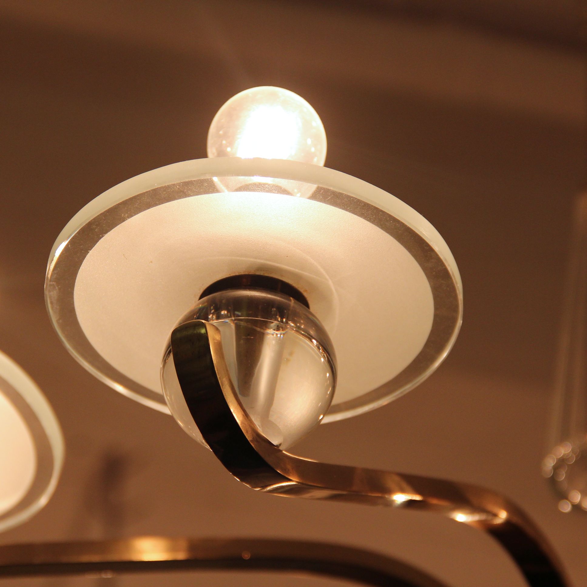 Die Art Deco Deckenleuchte besteht aus Messing. Auf 10 geschwungenen Armen befinden sich über Glaskugeln gesandstrahlte Scheiben mir Klarglasrand. Die Art Deco Deckenlampe befindet sich im Originalzustand.
