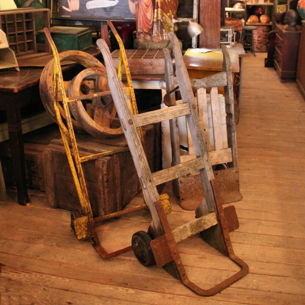 Im Requisitenfundus befinden sich verschiedene alte Sackkarren in unterschiedlicher Größe und Form.