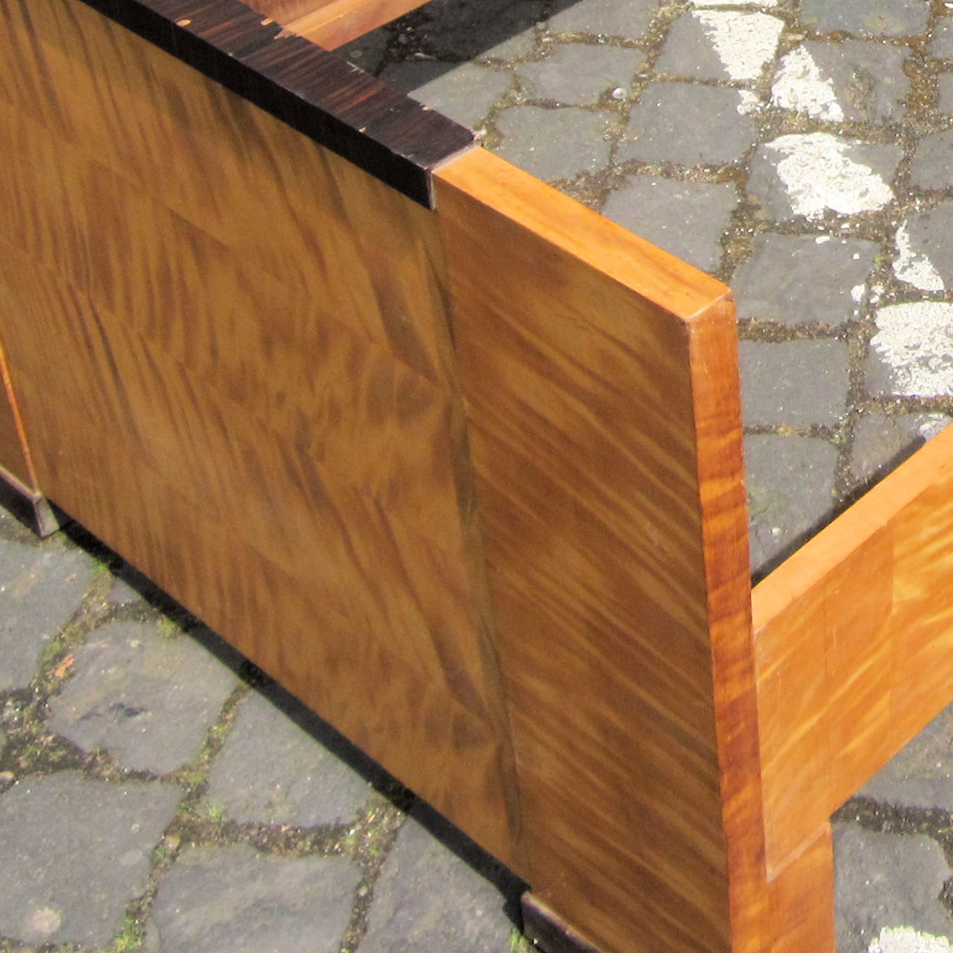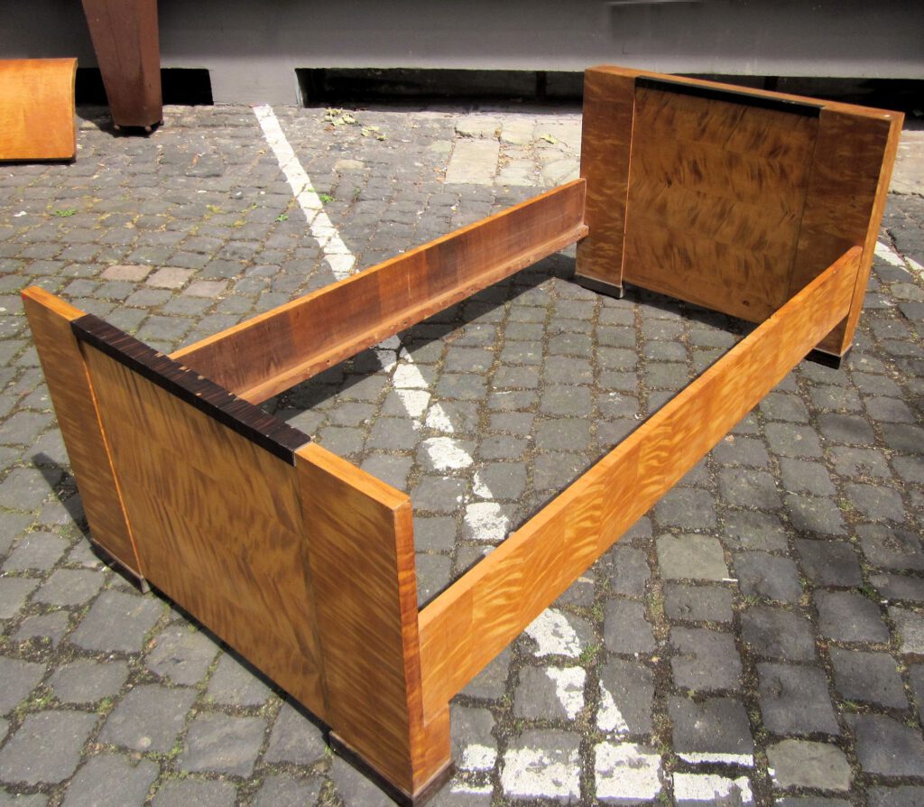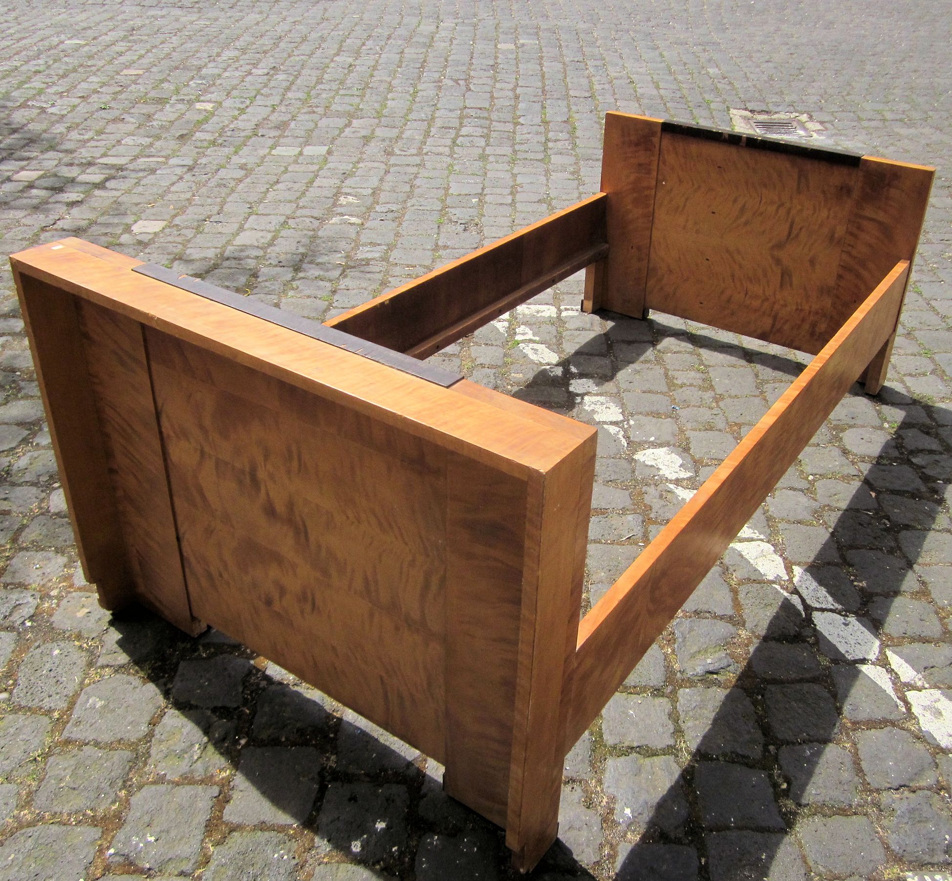 Das Einzelbett stammt aus den 20er Jahren und ist aus Birnenholz gearbeitet. An Kopf- und Fußende zeigen sich Applikationen aus Makassarfurnier. Es sind einige Gebrauchsspuren zu sehen.