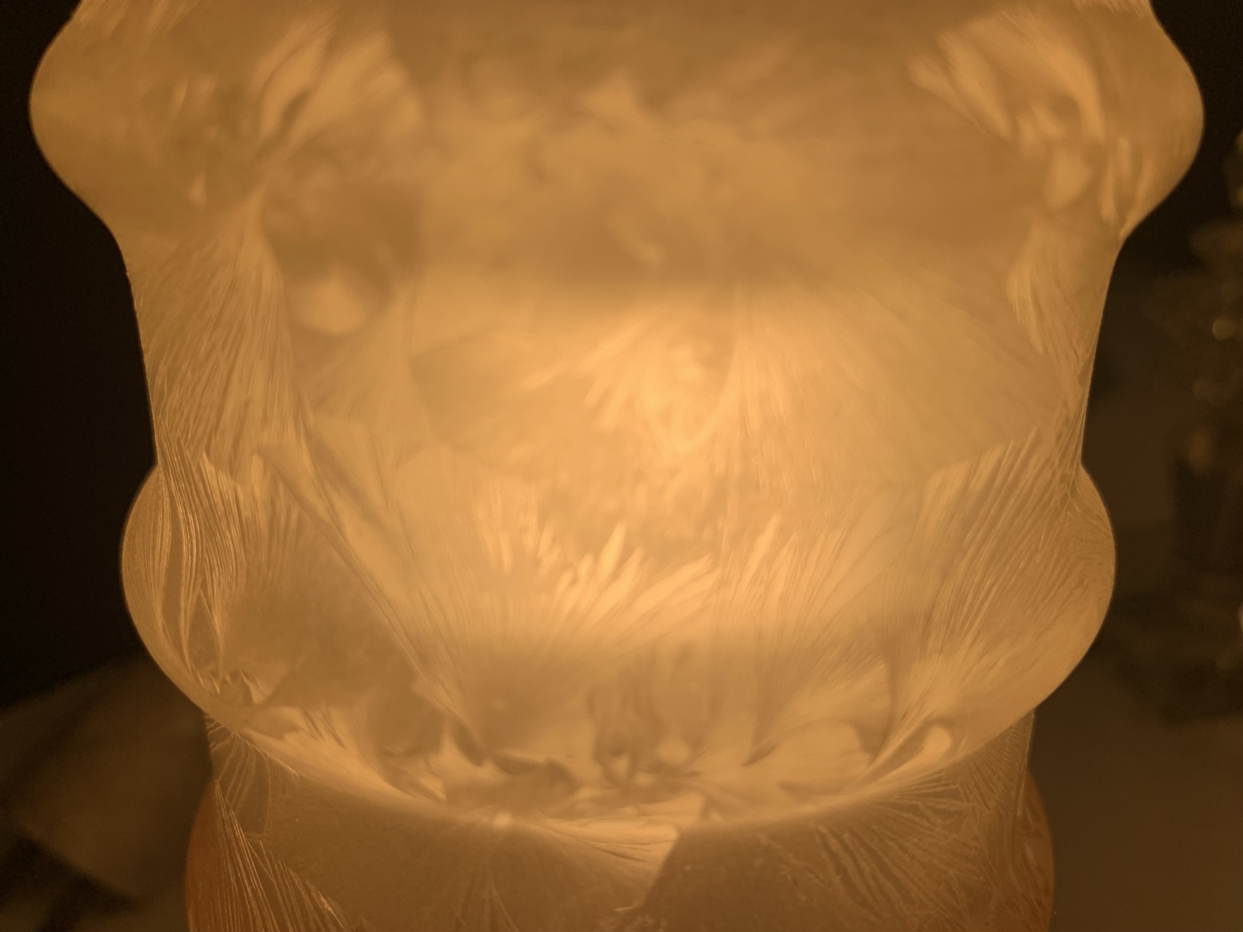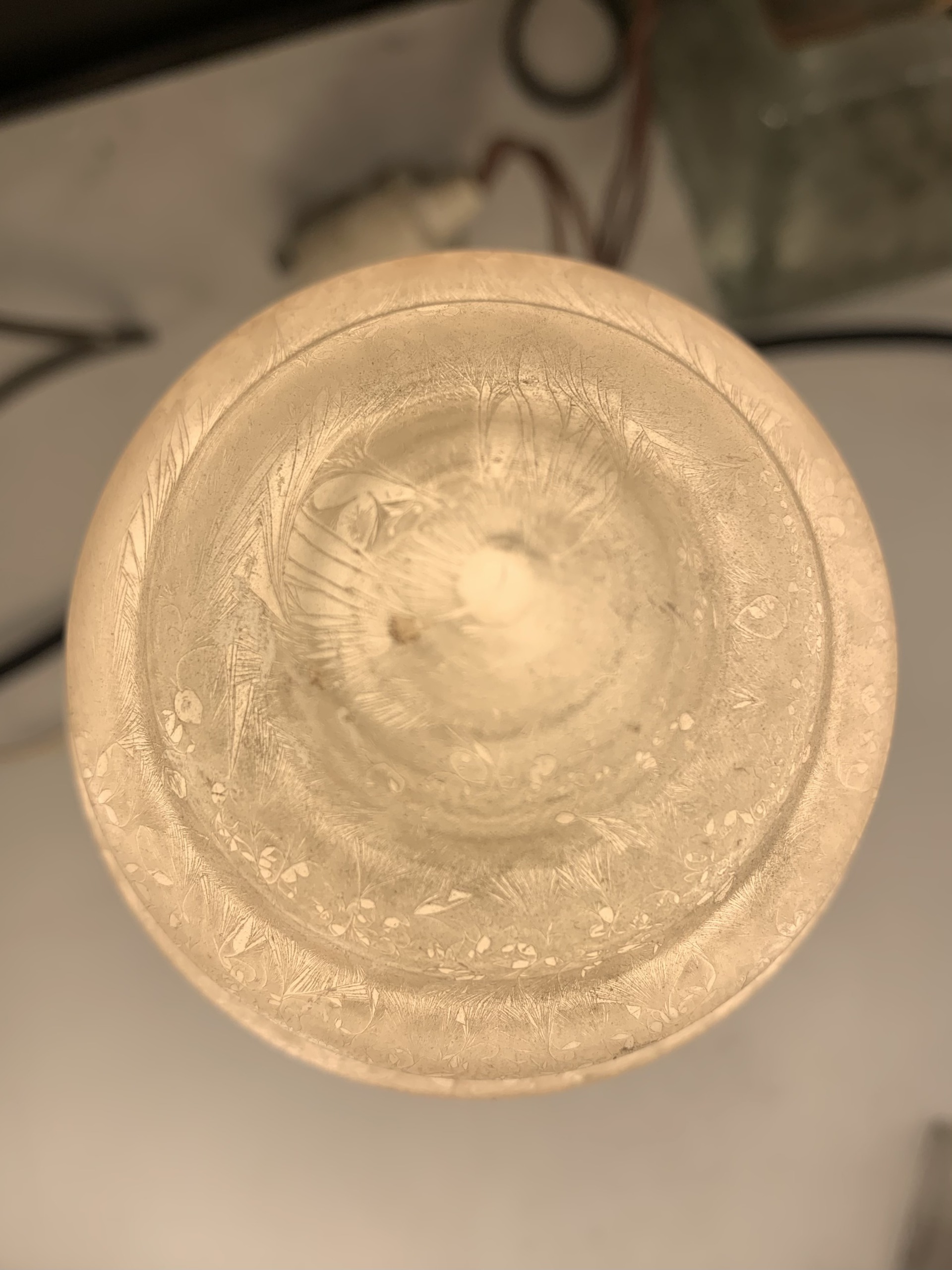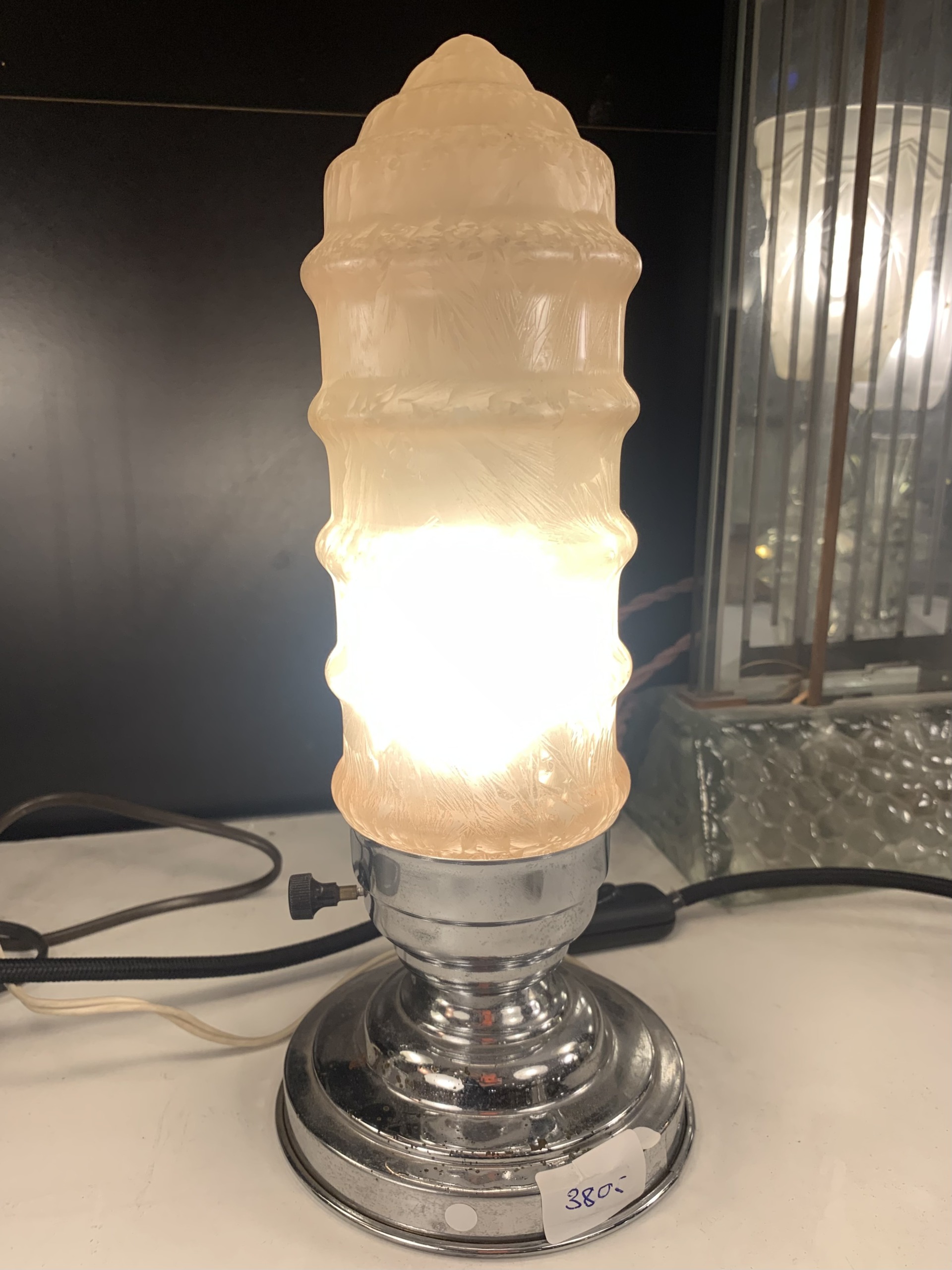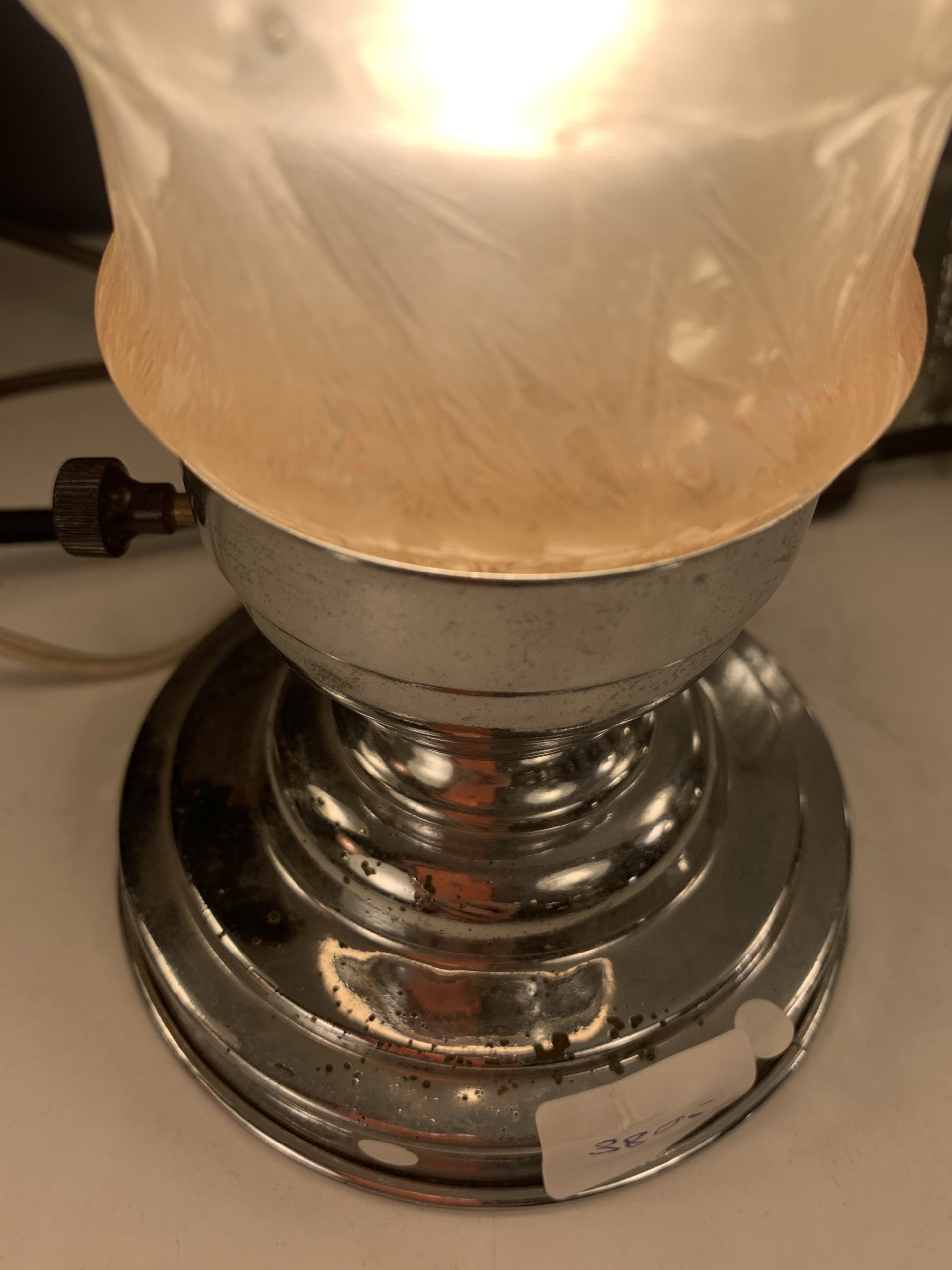 Der Lampenschirm der kleinen Art Deco Tischlampe besteht aus rose gefärbtem, geeistem Opalglas. Das Gestell ist vernickelt.
