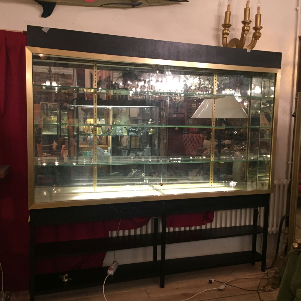 Glasvitrine mit Unterbau aus den 50er/60er Jahren, horizontal verjüngend, seitlich keilförmig zulaufend, Rückwand und Seiten verspiegelt.