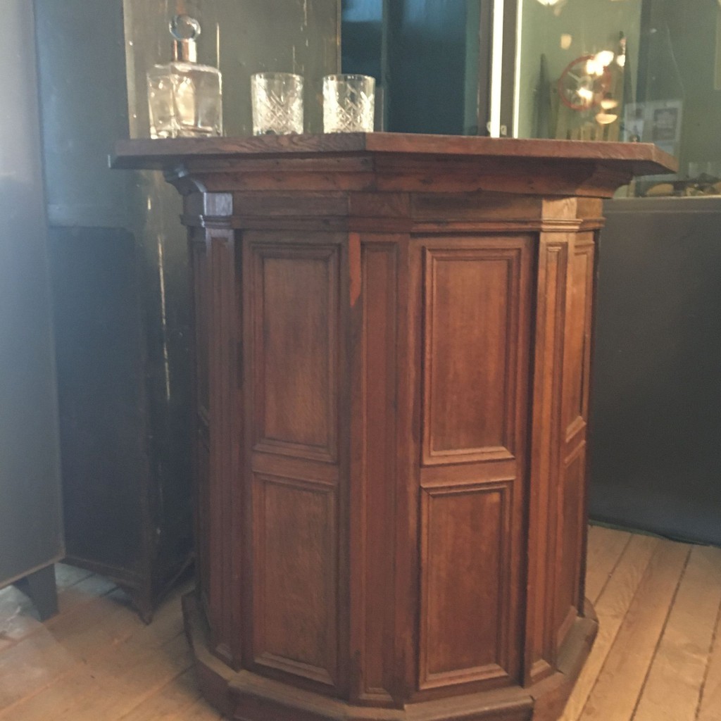Diese alte halbrunde Kirchenkanzel aus Eiche stammt wahrscheinlich aus der Zeit um 1900. Man kann sie idealerweise sehr gut als kleine Bar benutzen. Innen befindet sich ein Ablagebrett für Gläser und Flaschen.