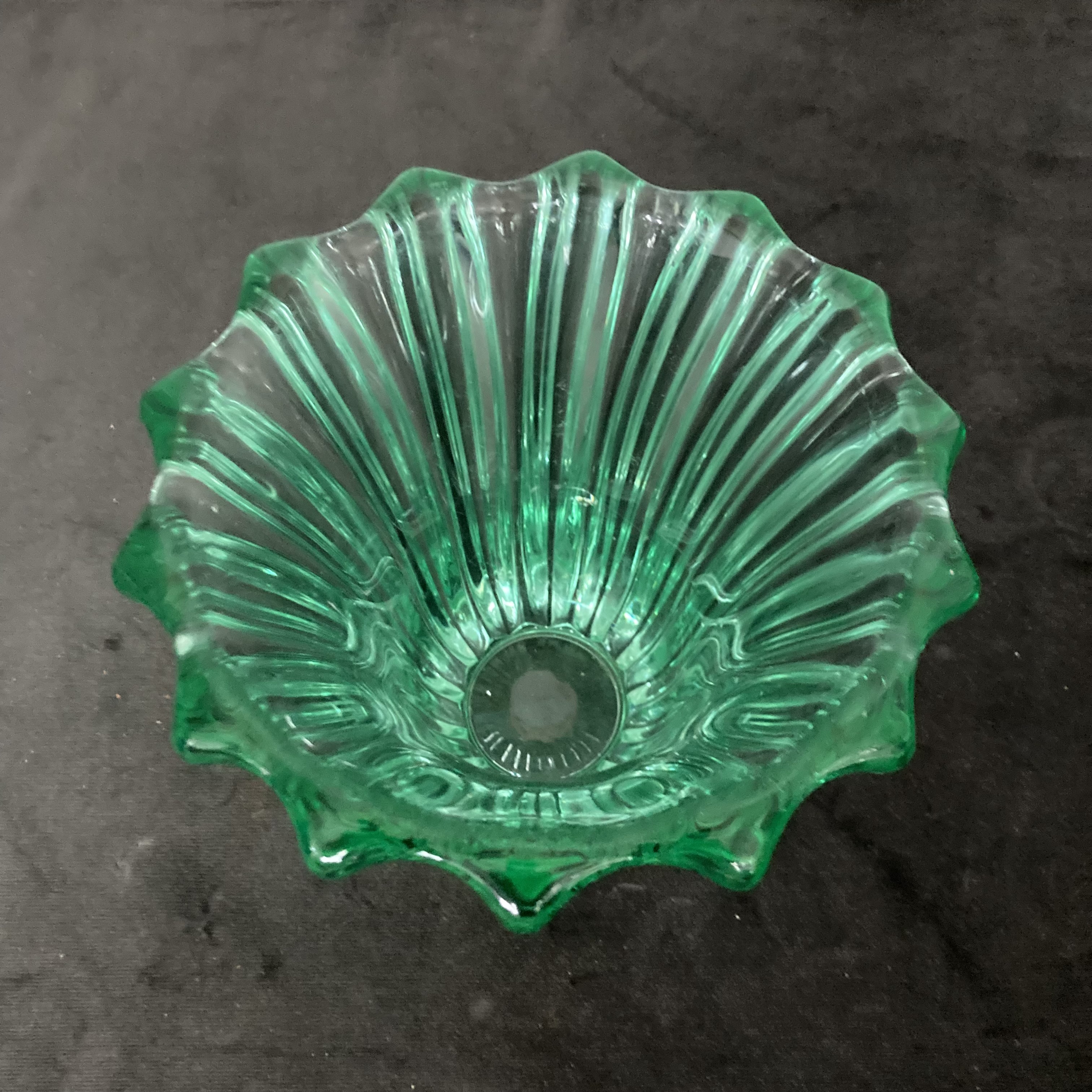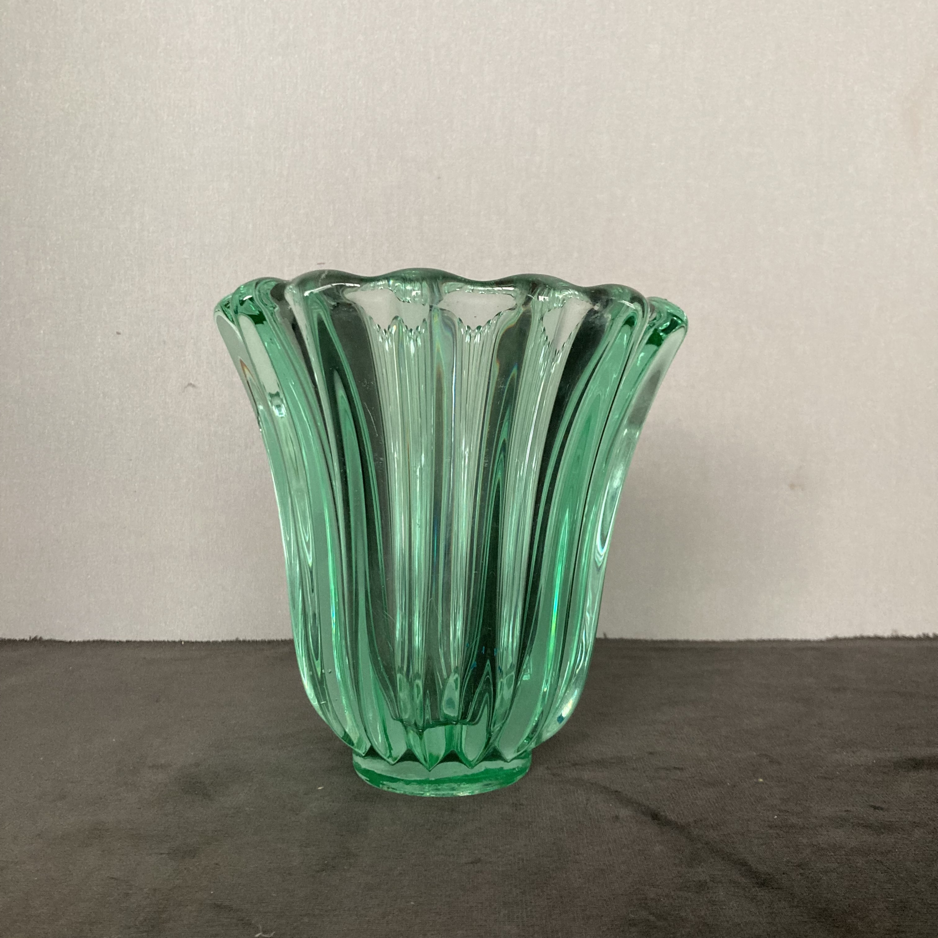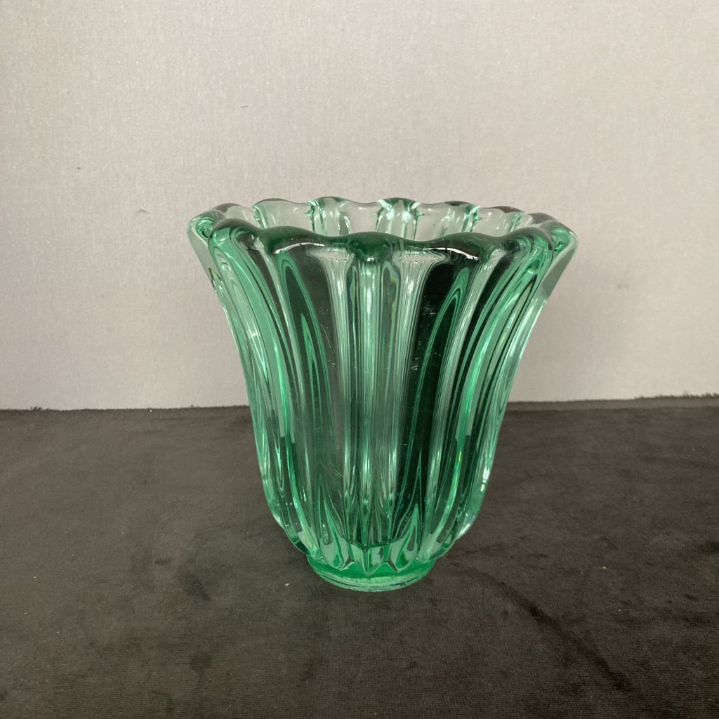 Wunderschöne grüne Art Deco Kristallvase mit rippenförmiger Wandung in massiver Ausführung von Pierre D’Avesn für Daum Nancy, Frankreich, 1930er Jahre.
