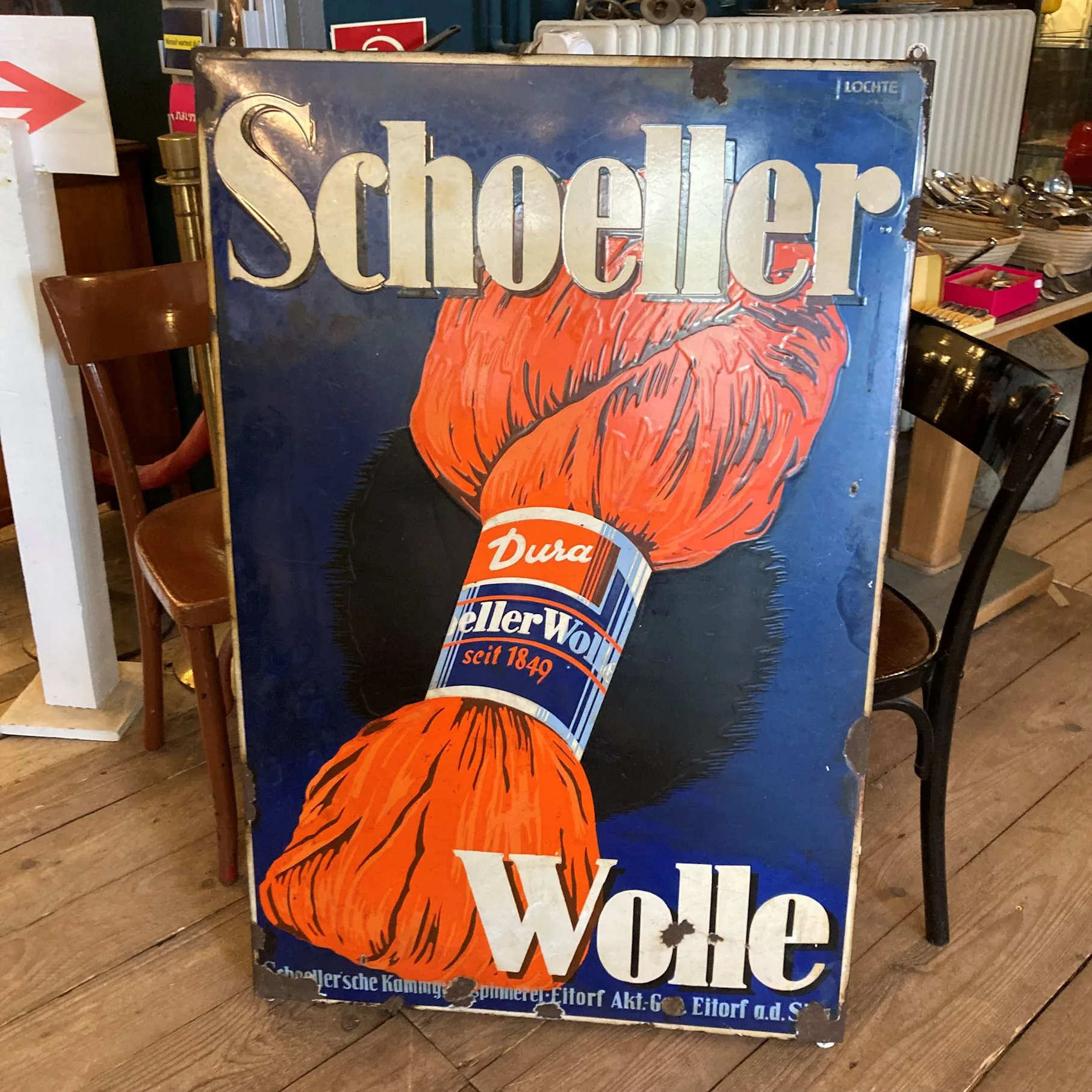 Werbeschild Schoeller Wolle, 1950er Jahre, das Schild weist altersgemäße sichtbare Gebrauchsspuren auf