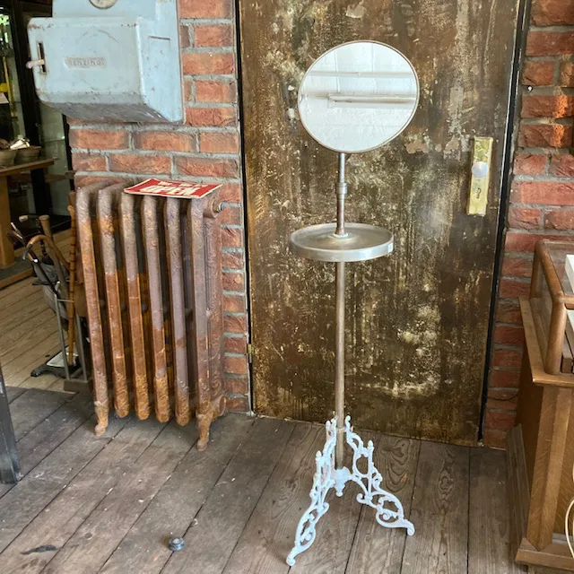 Barber Standspiegel mit Ablage aus Frankreich, um 1910. Spiegel verstellbar, Messingrohr, Gussfüße, Ablage Messing vernickelt.