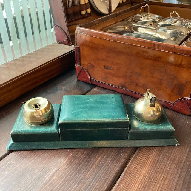 Traumtischset mit rundem Feuerzeug, Aschenbecher aus Messing und Zigarettenfach, Holz mit Leder bezogen. Von 1928, Frankreich.