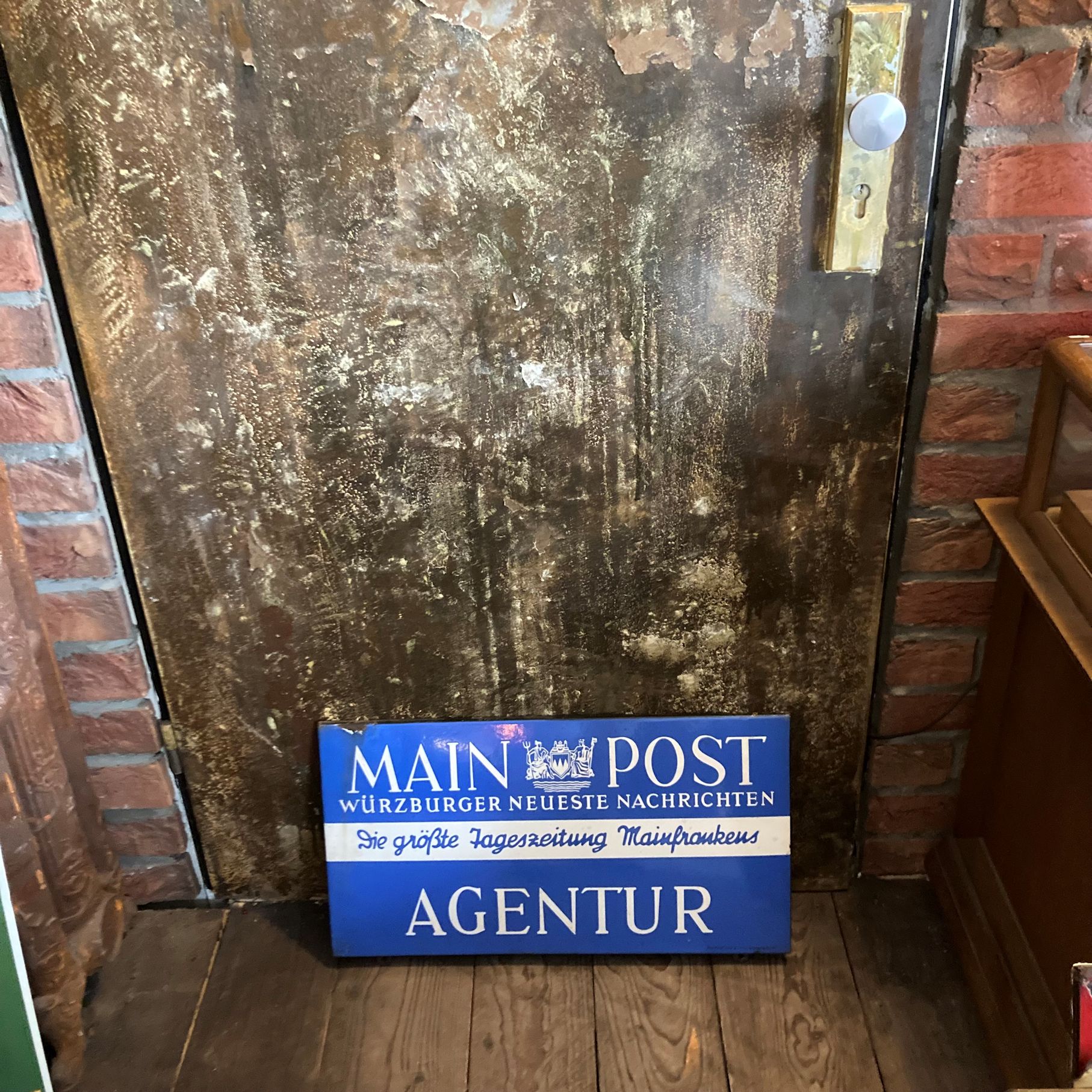 Werbeschild MAIN POST, Würzburger Neueste Nachtrichen , 1950er, das Schild weist altersgemäße sichtbare Gebrauchsspuren auf