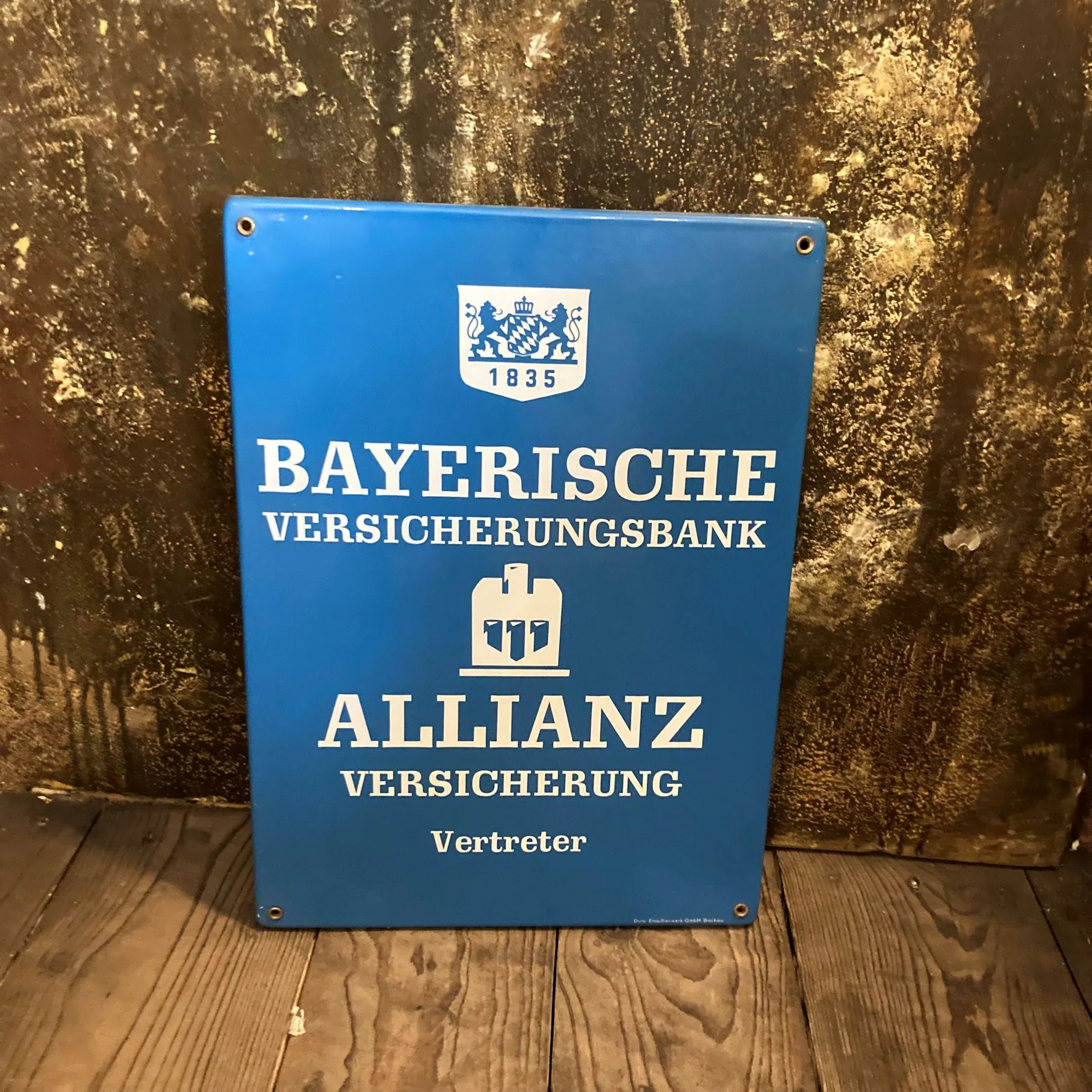 Werbeschild Bayerische Versicherungsbank, Allianz Versicherung, 1960er Jahre, das Schild weist altersgemäße sichtbare Gebrauchsspuren auf