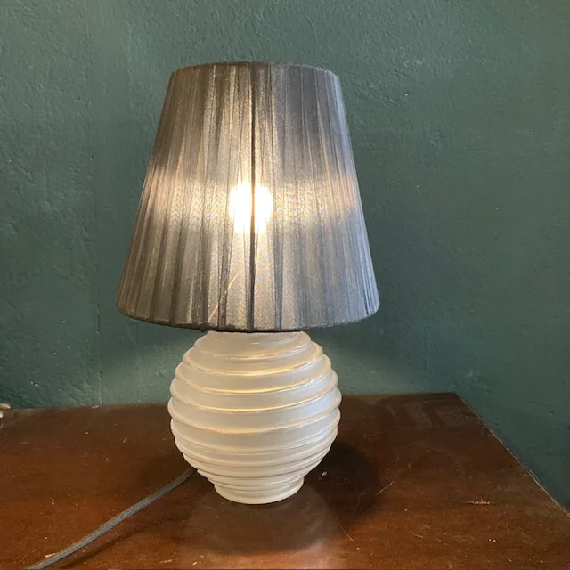 Die Tischleuchte aus den 1920er Jahren hat einen Fuss aus geätzdem Glas. Der Schirm ist neu. Die Leuchte wurde neu verkabelt.