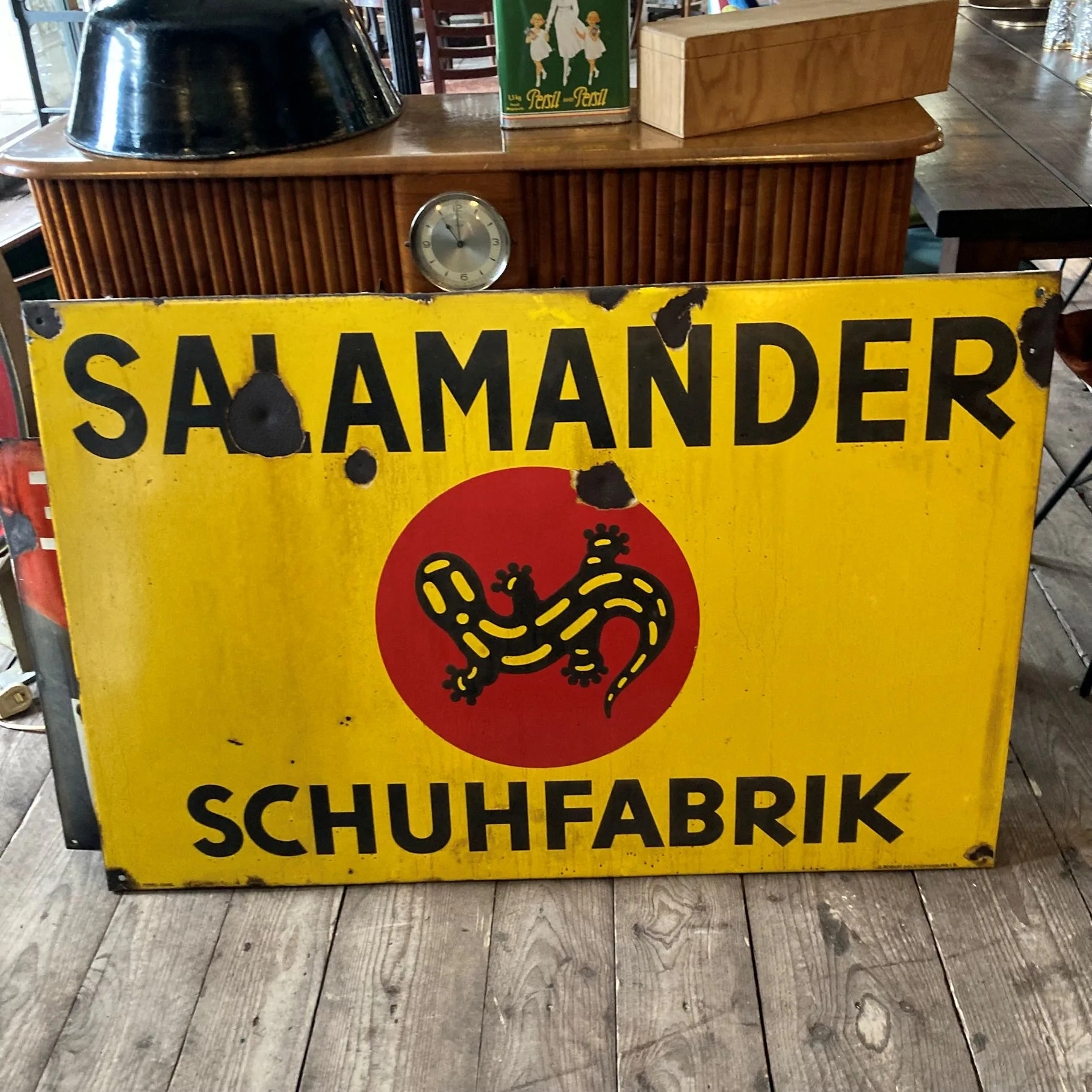 Emaille-Werbeschild Salamander Schuhfabrik, um 1950. Das Schild weist altersgemäße Gebrauchsspuren auf.
