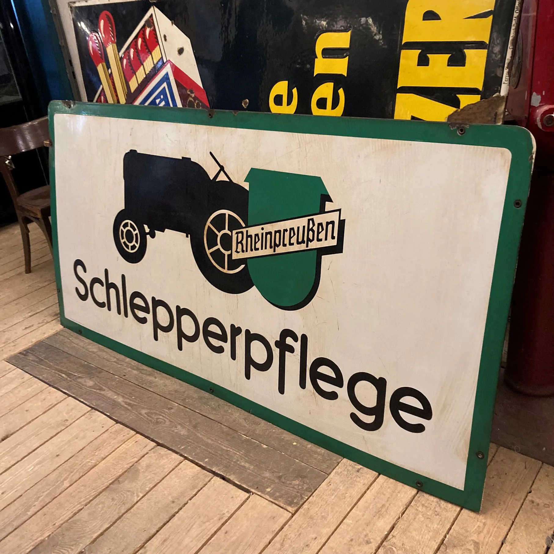 Werbeschild Rheinpreußen Schlepperpflege, ca. 1955. Das Schild weist altersgemäße Gebrauchsspuren auf.