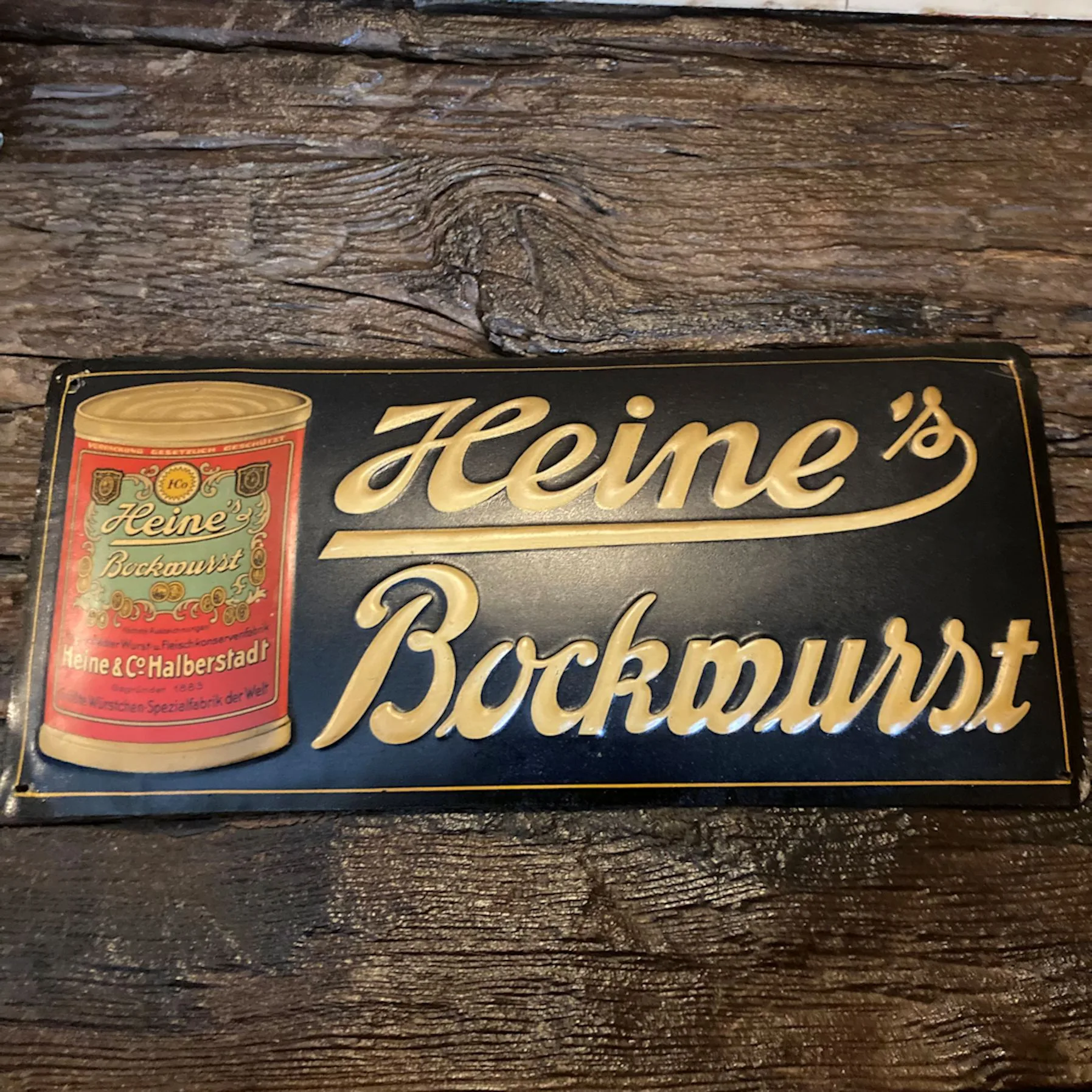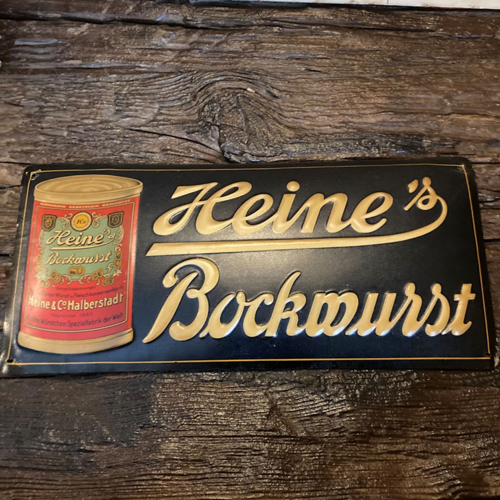 Blech-Werbeschild Heine’s Bockwurst, um 1910. Das Schild befindet sich in einem sehr guten altersgemäßen Zustand.