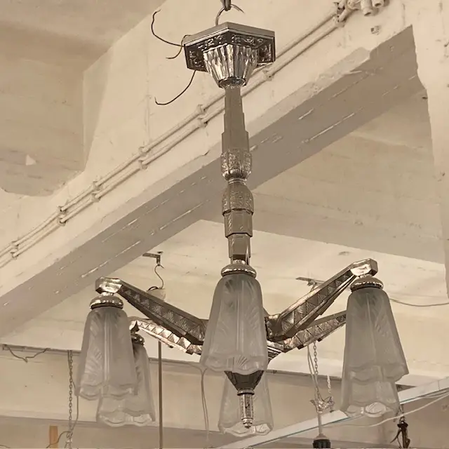 Original Art Deco Deckenleuchte aus Frankreich, neu vernickelt, Glas alt.Der Leuchter wird neu verkabelt verkauft.