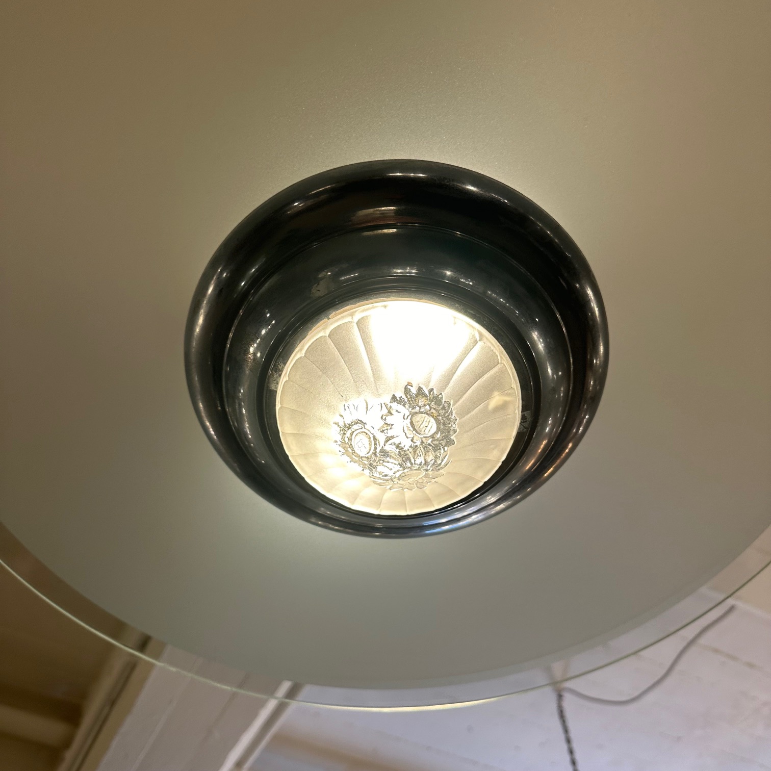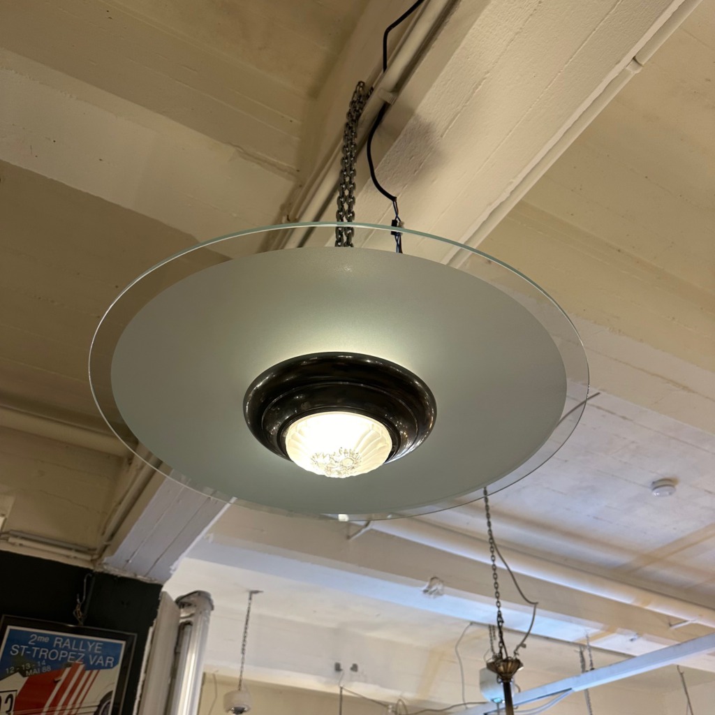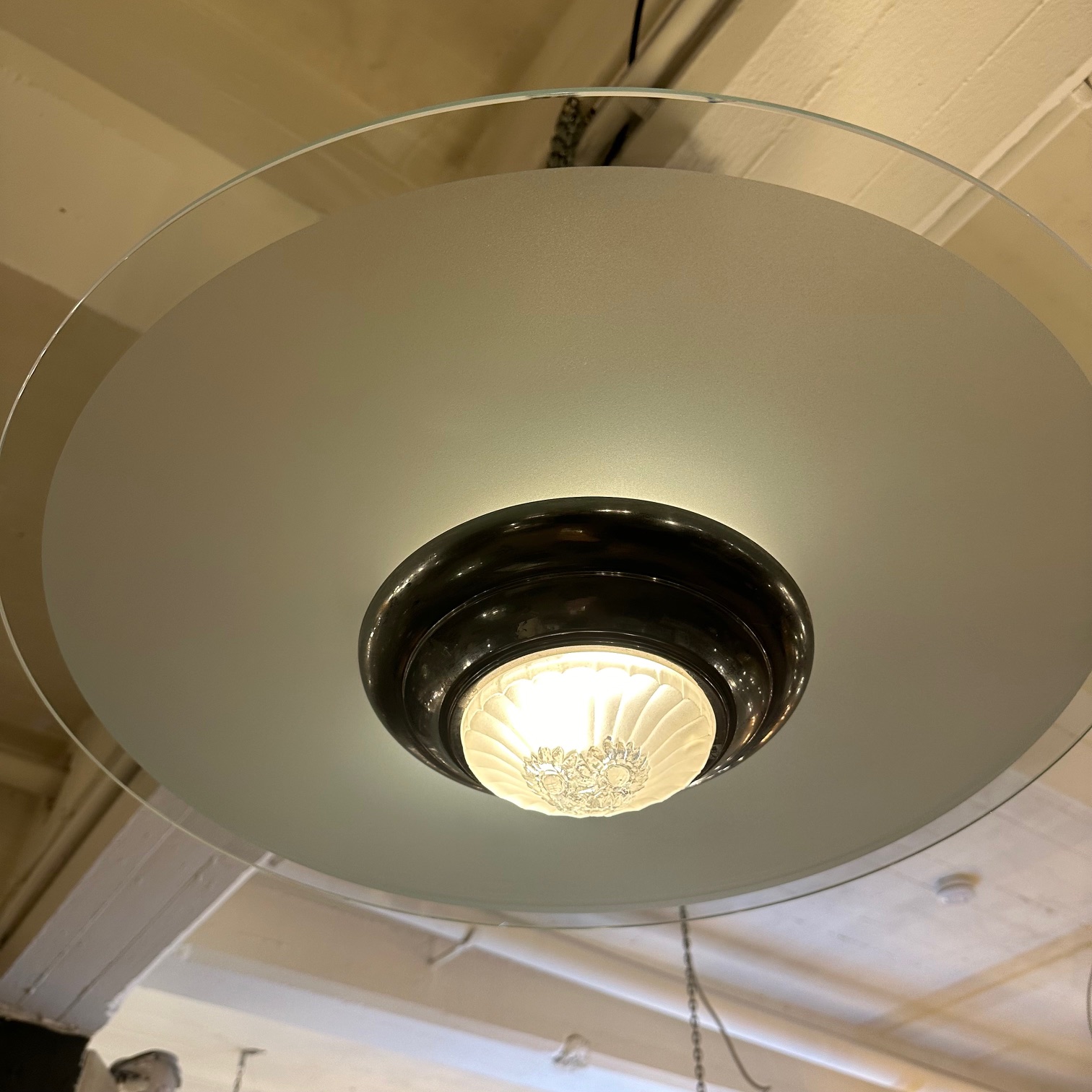 wunderschöne, runde Deckenleuchte von Ezan, neu verkabelt, Mittelglas Originalzustand, gesandstrahltes Glas mit klarem Rand neu