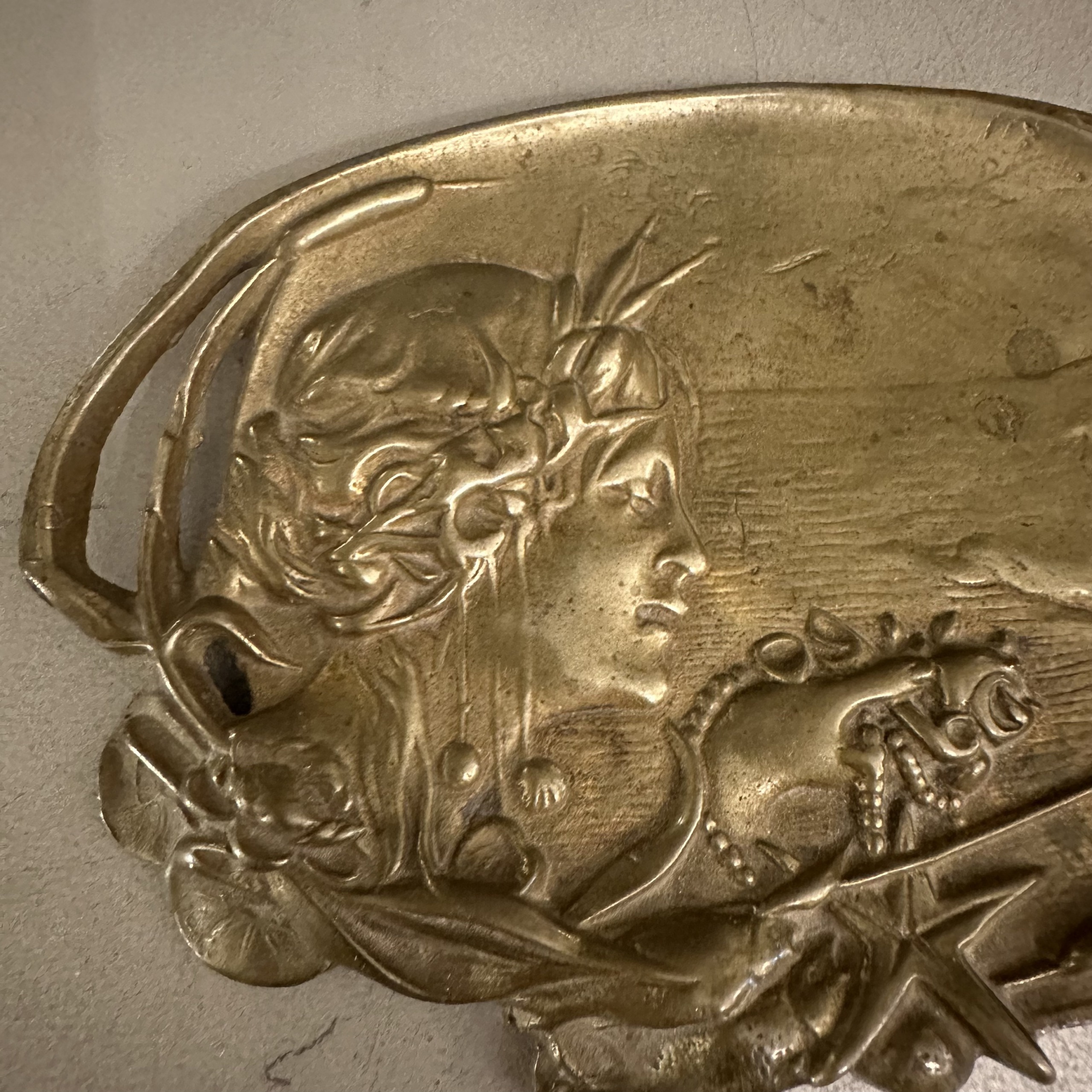 Diese kleine Schale aus Messing ist ein hübsches Dekorationsobjekt mit den typischen Jugenstilmotiven der damaligen Zeit. Sie kann als kleine, edle Ablageschale für z.B. Visitenkarten genutzt werden