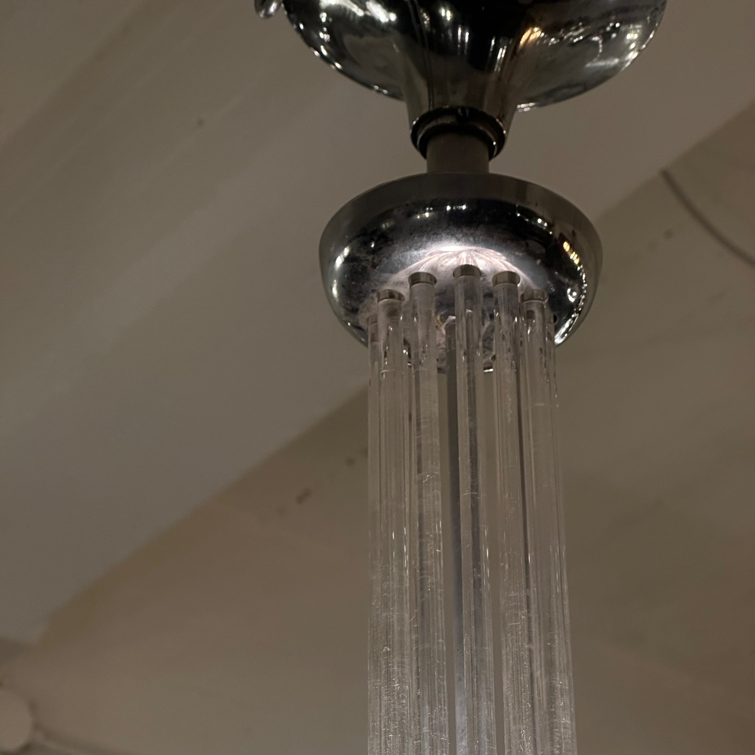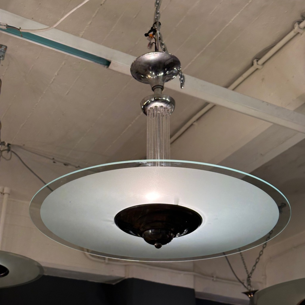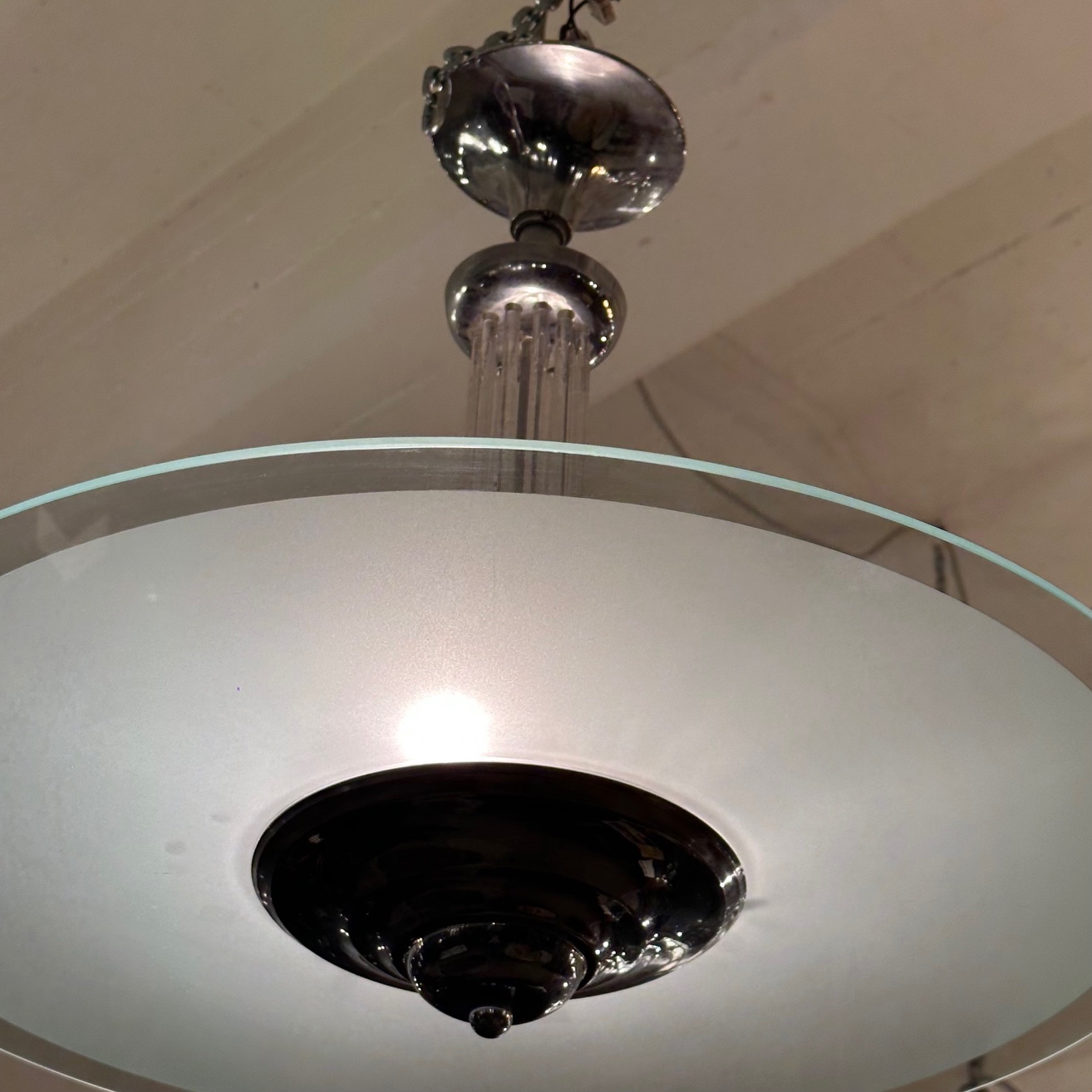 Elegante, runde Art Deco Deckenleuchte aus Frankreich, neu verkabelt. Mittelglas im Originalzustand, gesandstrahltes Glas mit klarem Rand. Ideal für jede Wohnumgebung.