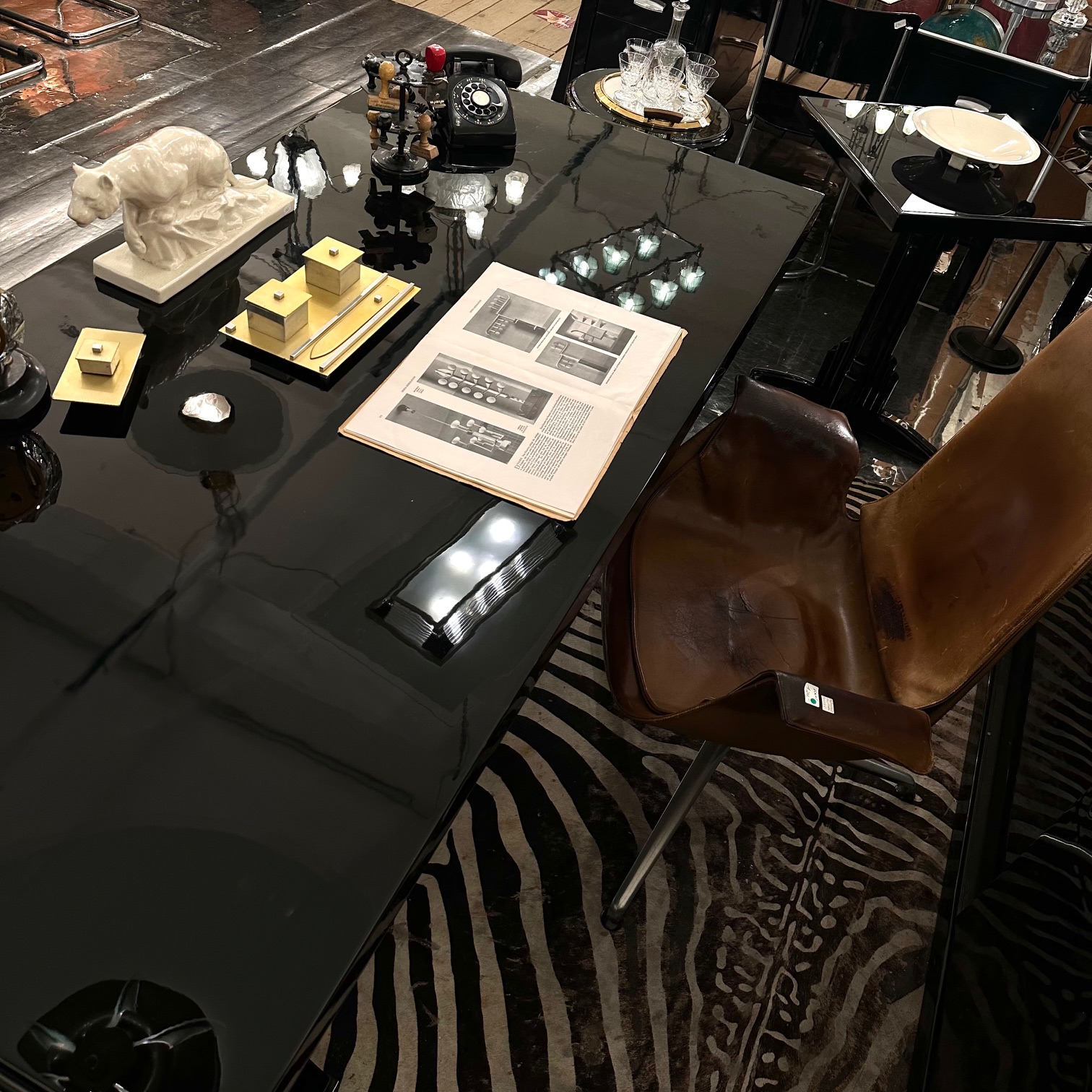 Der Tisch ist restauriert und hochglanzschwarz lackiert.