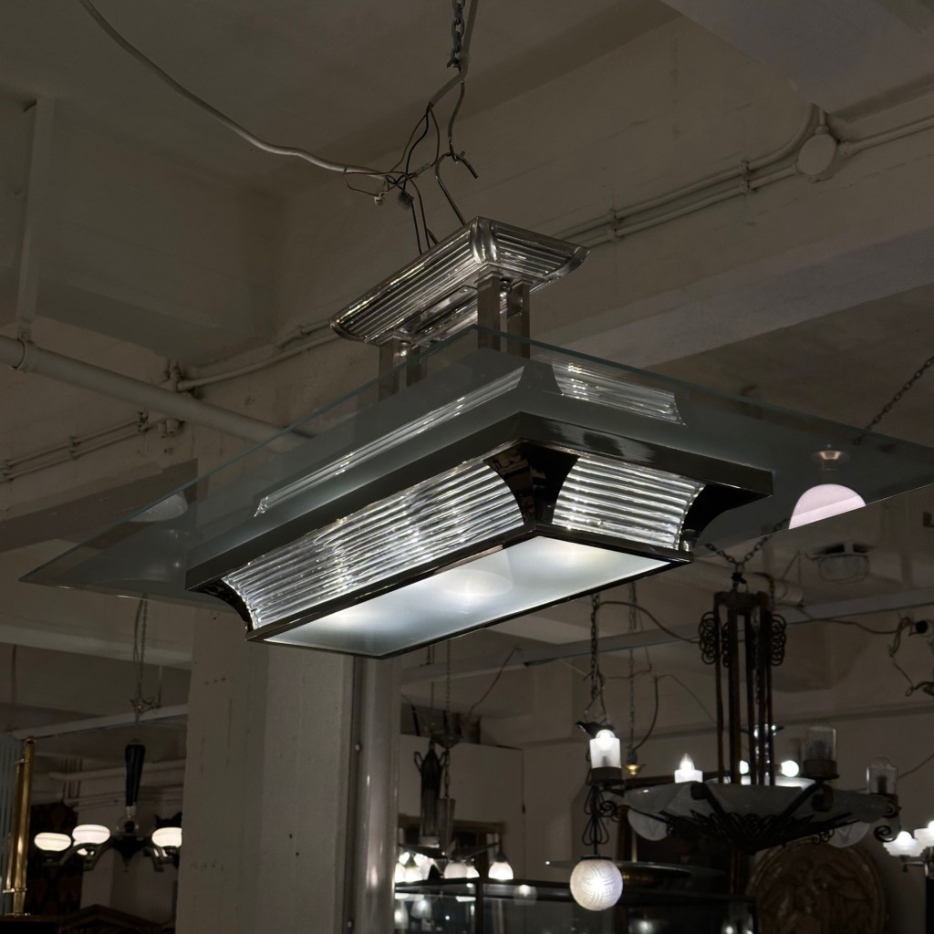 Diese elegante Deckenleuchte im typischen Art Deco-Stil der 1930er Jahre verleiht jedem Raum einen Hauch von Luxus. Mit geometrischen Formen und stilisierten Akzenten aus hochwertigem Glas und Metall erleuchtet sie sanft und schafft eine warme Atmosphäre. Ihr zeitloses Design, das klare Linien und raffinierte Details vereint, macht sie zu einem Blickfang in Wohnzimmern, Esszimmern oder Eingangsbereichen. Ideal für Liebhaber des klassischen Designs.