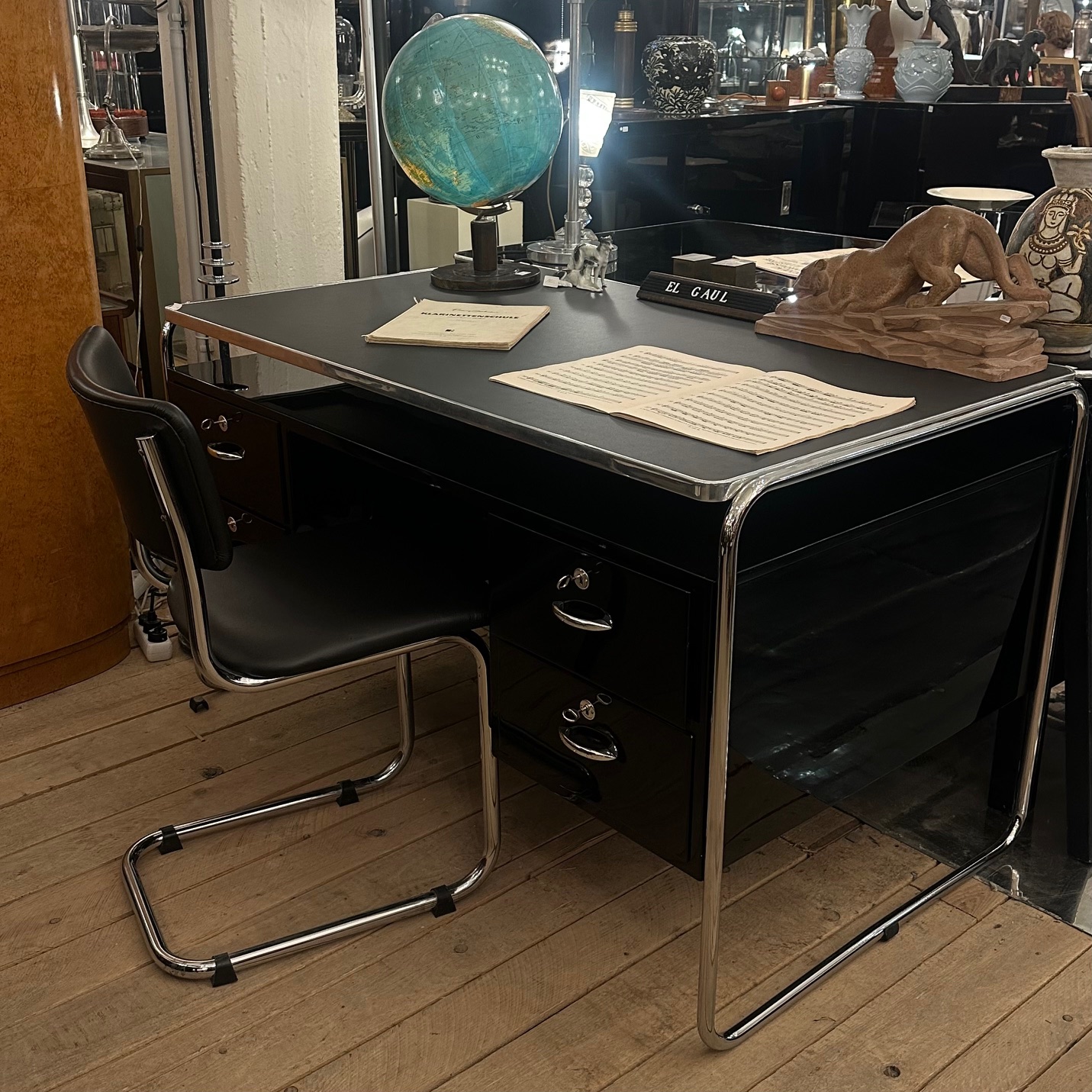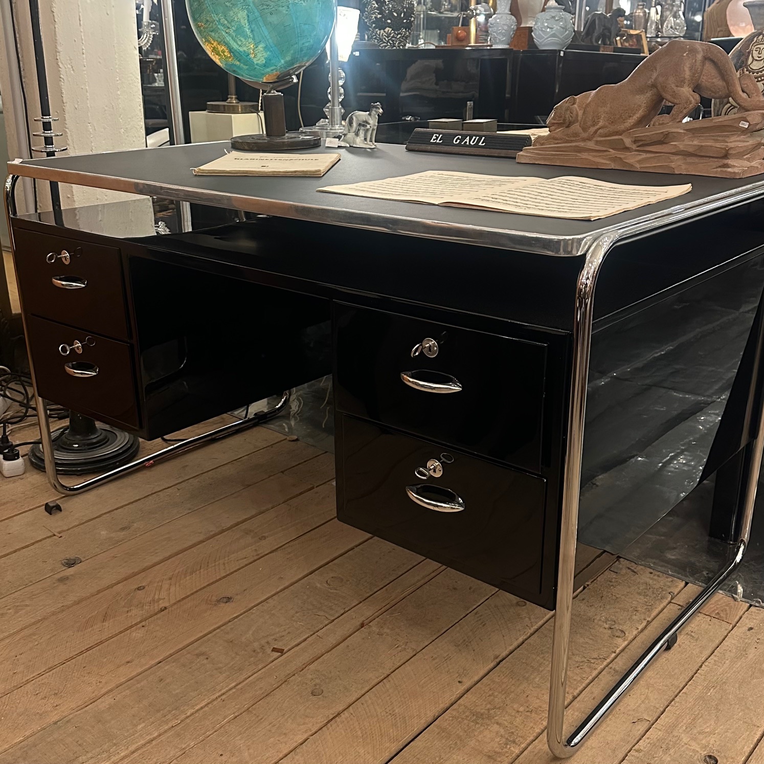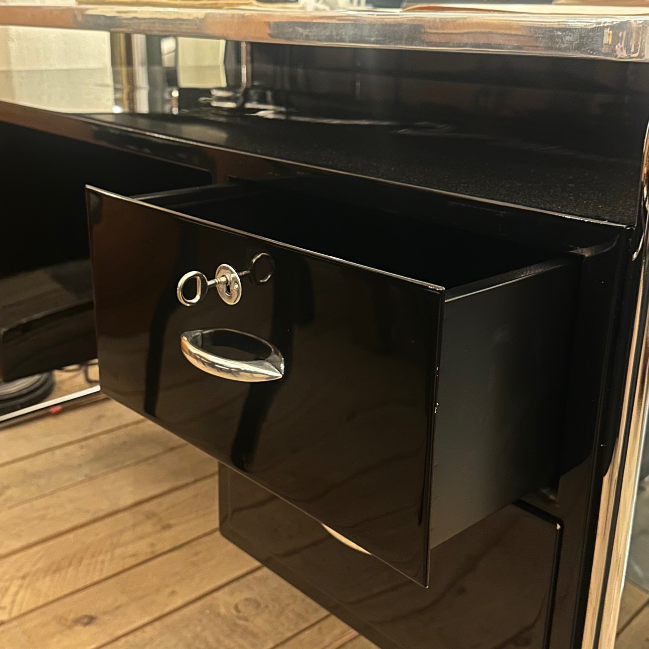 Schreibtisch aus der Art-Déco-Zeit mit klassischer Stahlrohrkonstruktion und schwarzem Hochglanzfinish. Die klaren Linien, verchromten Kanten und formschönen Griffe verleihen ihm eine zeitlose, industrielle Eleganz. Mit insgesamt vier abschließbaren Schubladen bietet er viel Stauraum für stilvolles Arbeiten. Ein ikonisches Möbelstück für Designliebhaber und Sammler.