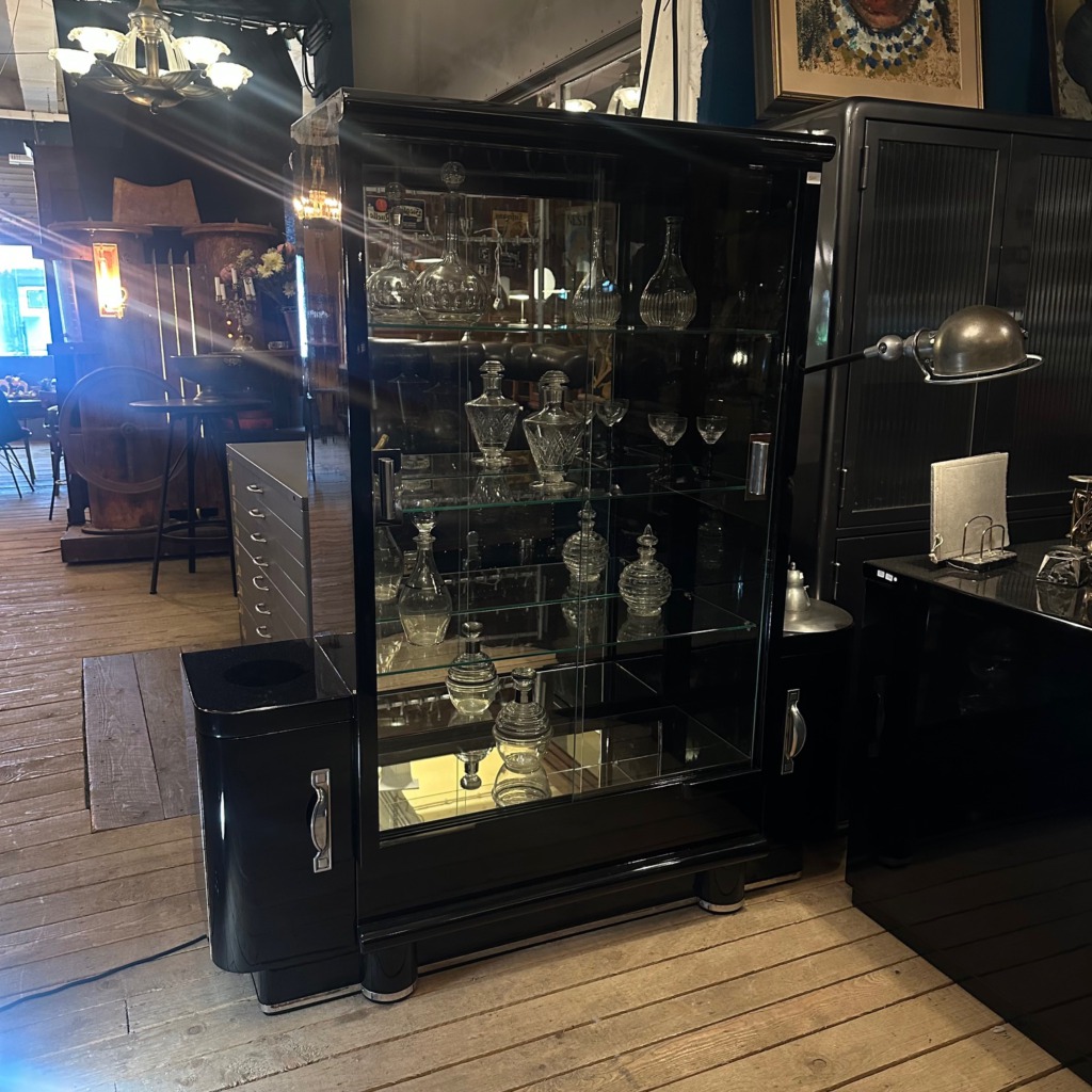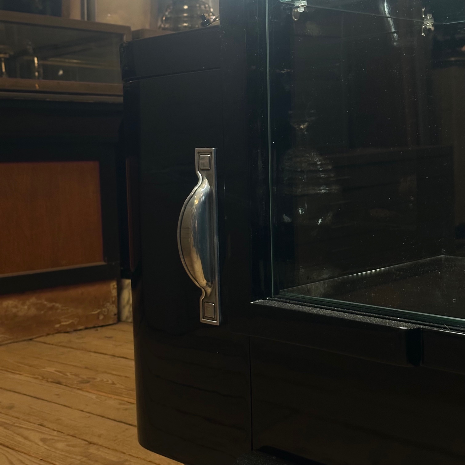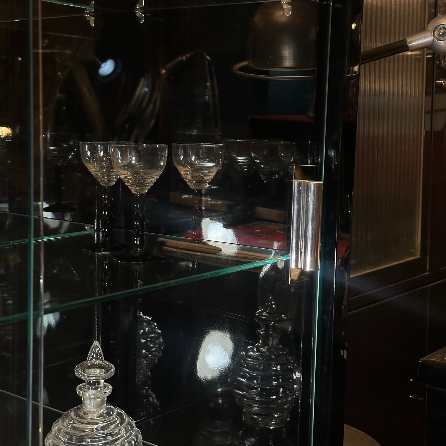 Diese elegante Glasvitrine aus den 1930er Jahren ist ein herausragendes Beispiel für das stilvolle Design der Art Deco Epoche. Der Korpus besteht aus hochglänzend lackiertem Holz in tiefem Schwarz und ruht auf markanten, abgerundeten Füßen, die der Vitrine eine solide, dennoch elegante Präsenz verleihen.