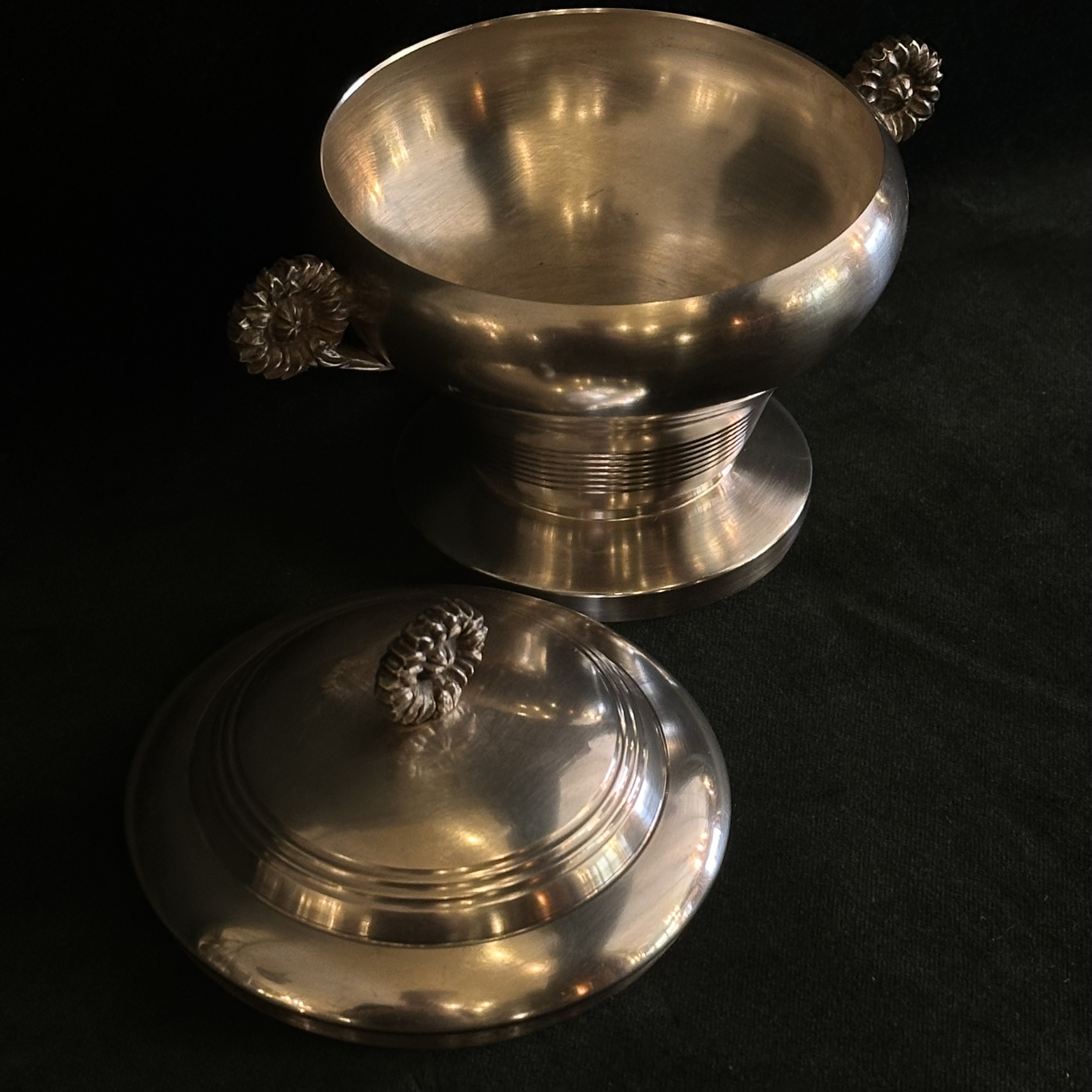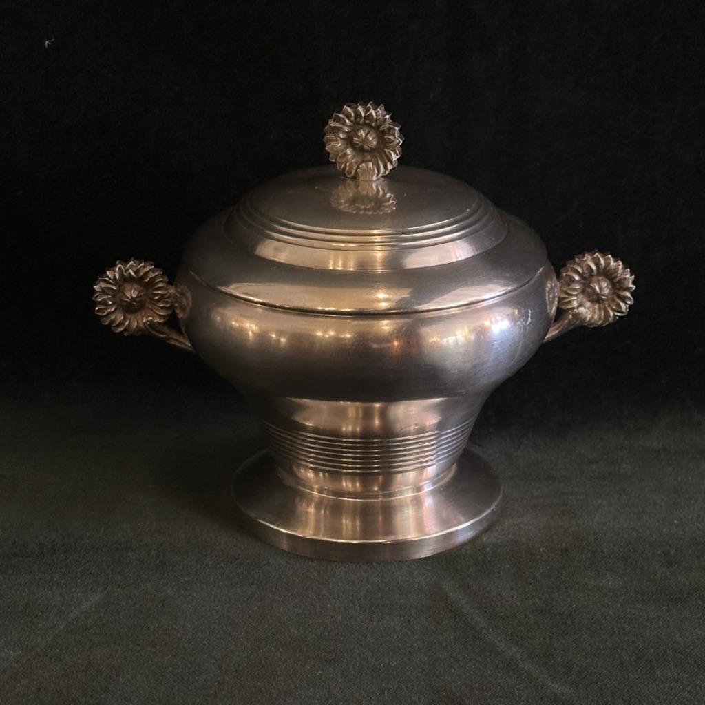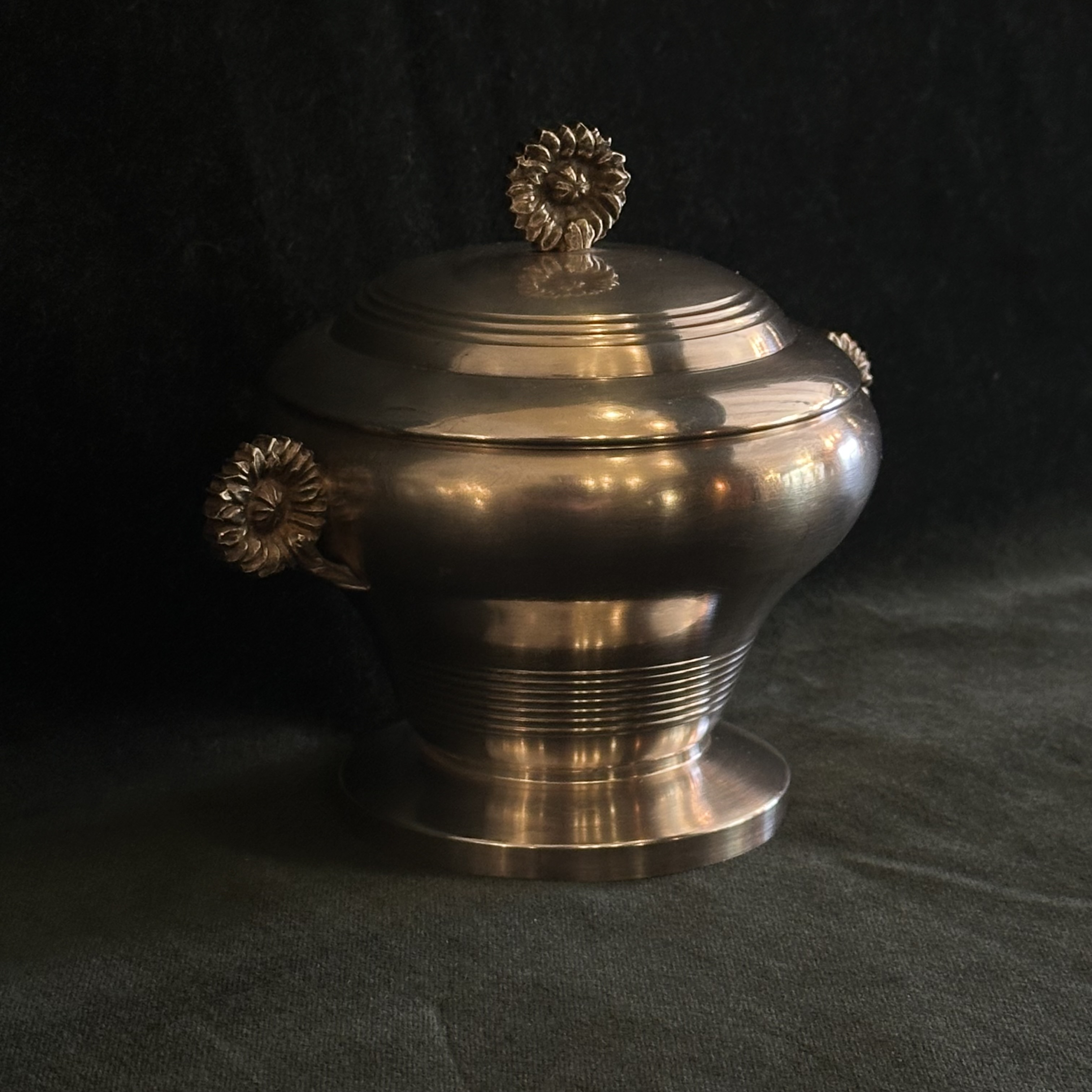Elegante Zuckerdose aus den 1930er-Jahren, versilbert und mit feinen, stiltypischen Verzierungen. Die klassische Form und die dezenten Ornamente verleihen ihr zeitlose Schönheit und einen Hauch von Art déco. Ein charmantes Sammlerstück oder stilvolles Accessoire für jede Kaffeetafel. Gut erhalten mit schöner Patina – ein echtes Schmuckstück aus vergangener Zeit.