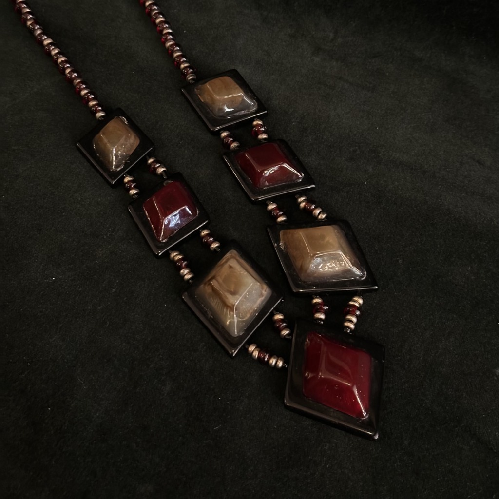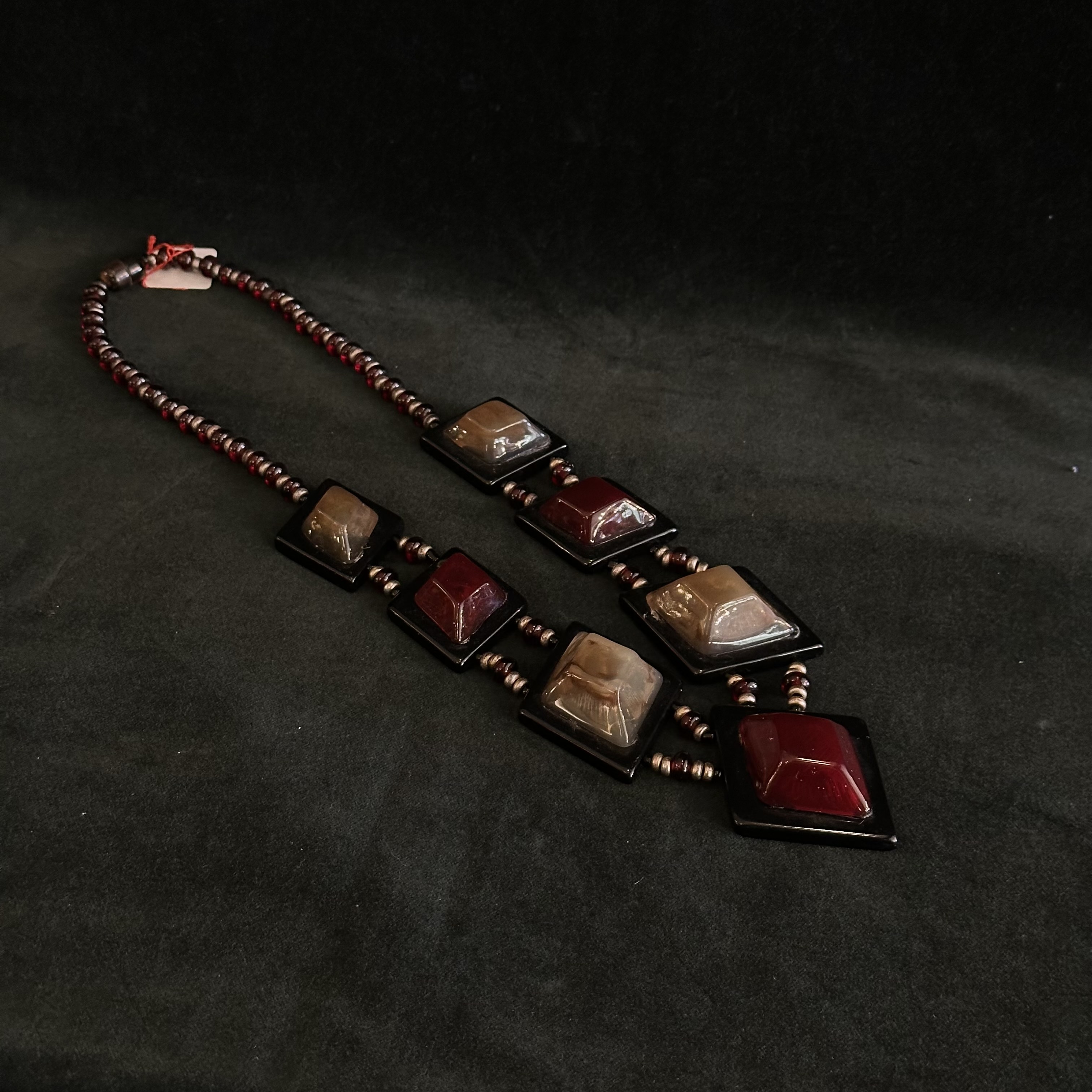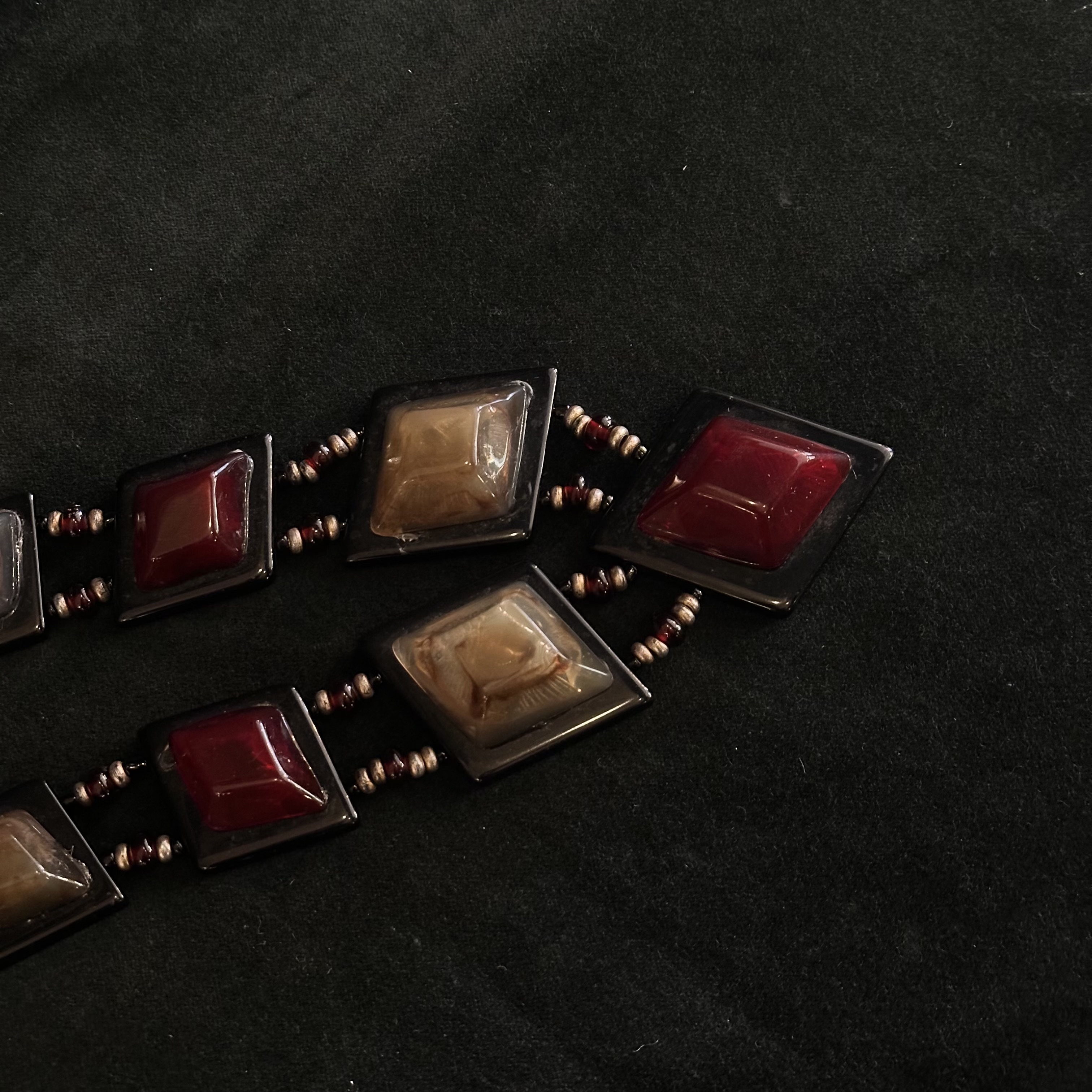 Auffällige Bakelit-Kette aus den 1980er-Jahren mit geometrischem Design und markanter Farbgebung in Rot- und Brauntönen. Die großen, pyramidenförmigen Elemente auf schwarzen Rautenplatten verleihen der Kette einen starken Vintage-Charakter. Ein authentisches Statement-Stück aus der Bakelit-Ära – ideal für Liebhaber außergewöhnlicher Schmuckdesigns mit Retro-Charme.