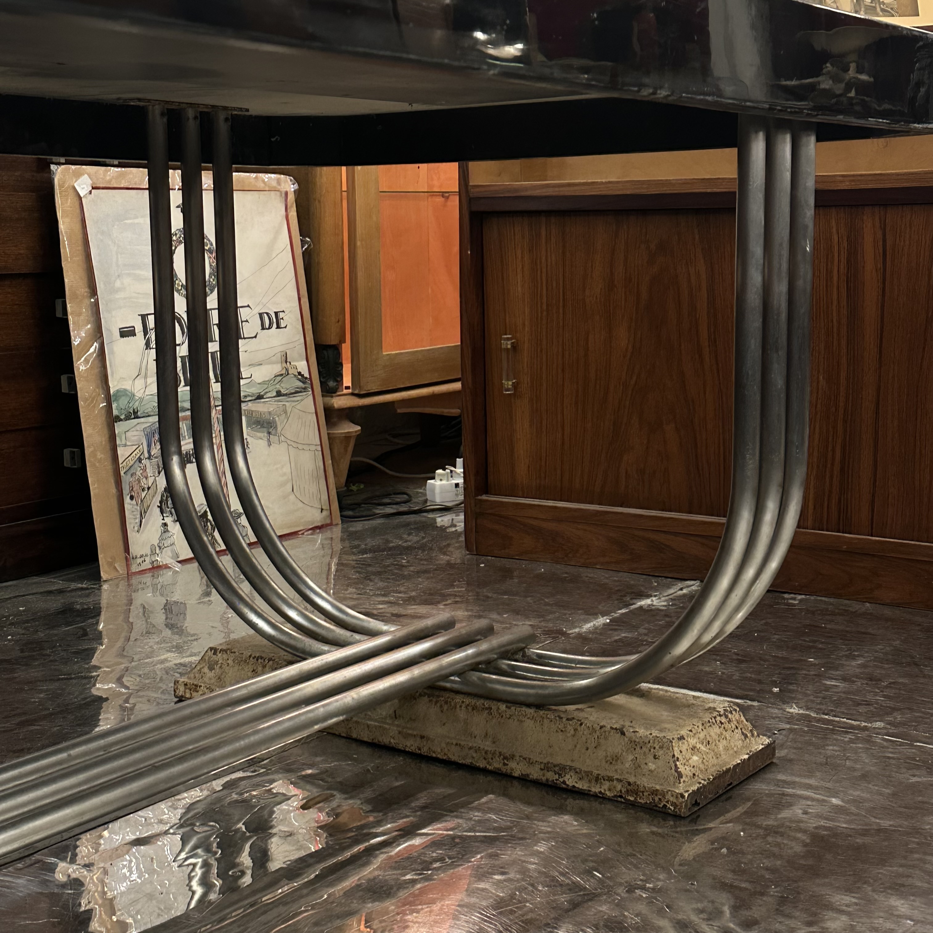 Eleganter Design-Tisch von Gispen & De Stijl Amsterdam, entstanden um die 1930er-Jahre. Das filigrane Metallgestell zeigt klare Linien im klassischen Bauhausstil – funktional, reduziert und zeitlos. Die Tischplatte bildet dazu einen spannenden Kontrast: Hochglanzschwarz lackiert, spiegelt sie die elegante Formsprache des Art Déco der 1920er-Jahre wider. Eine besondere Kombination zweier ikonischer Designströmungen – technisch präzise, formal ausgewogen und stilistisch außergewöhnlich. Ein rares Sammlerstück mit starker gestalterischer Aussage.