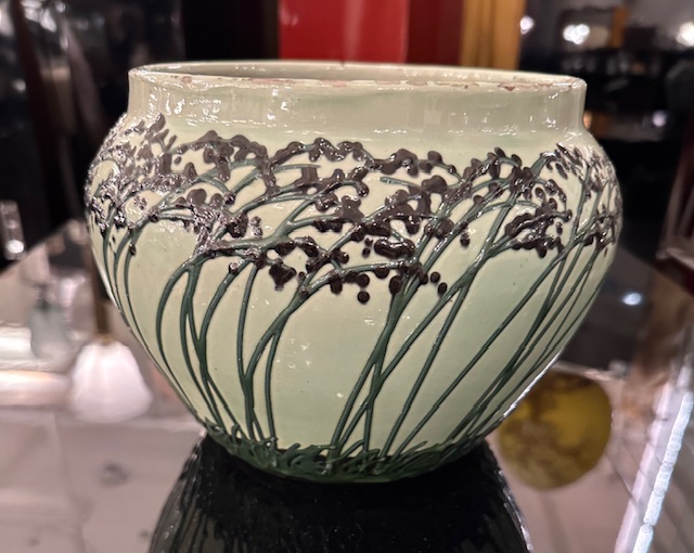 Handgefertigtes, traditionelles Keramik-Gefäß aus den 1910er Jahren. Auch als Jugendstil-Vase zu benutzen. Der Entwurf stammt von Prof. Max Laeuger, Kandern. Das Gefäß ist mit einer Schlickglasur versehen und weist leichte Beschädigungen auf.