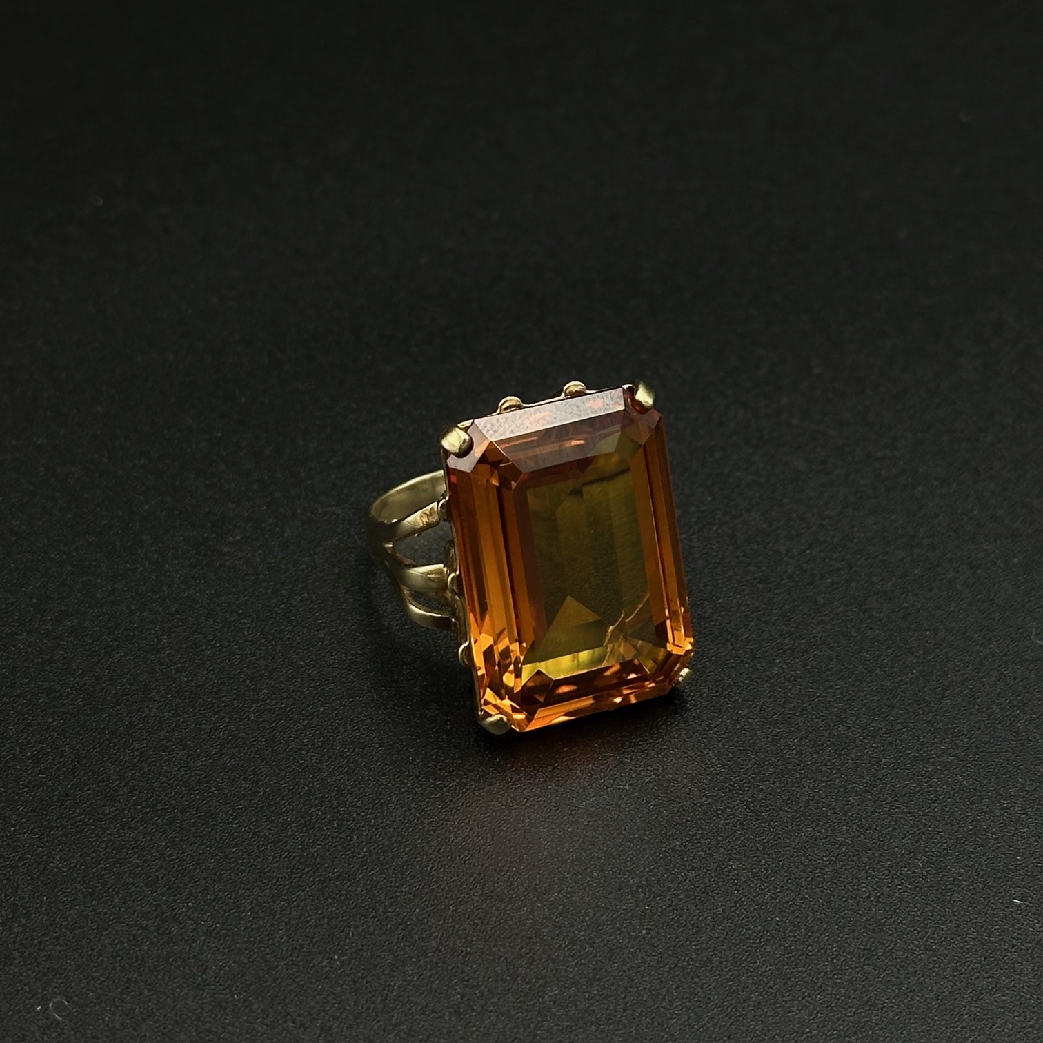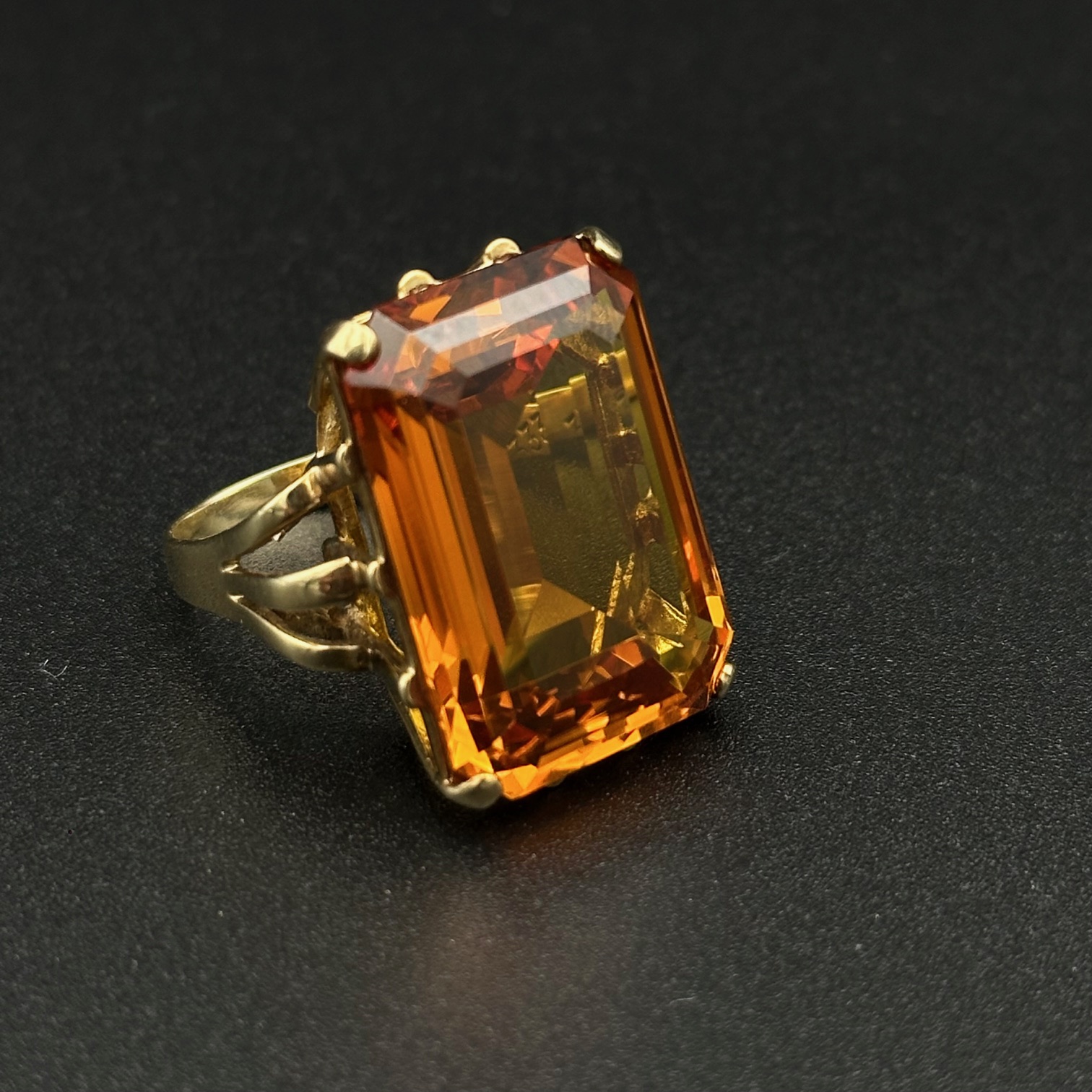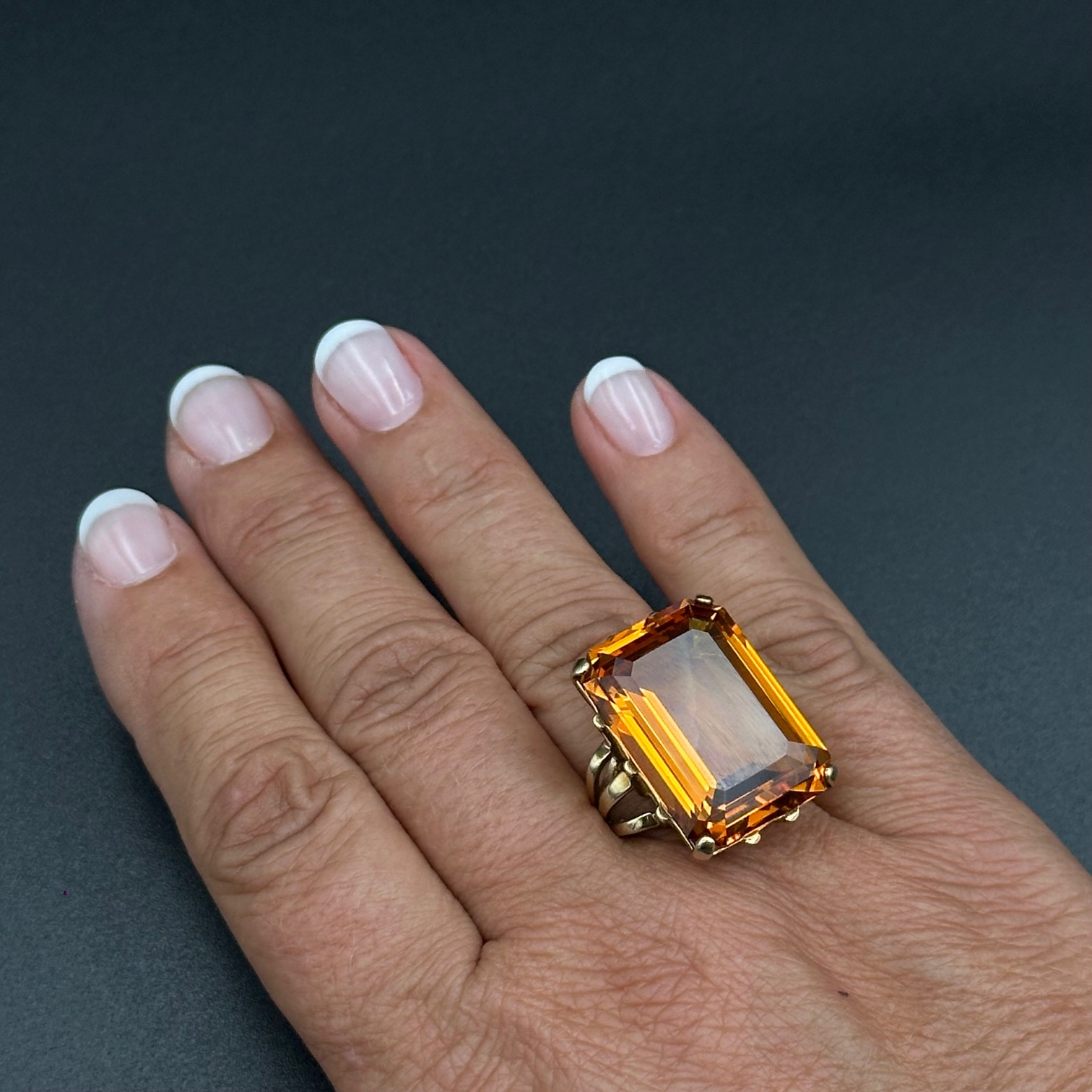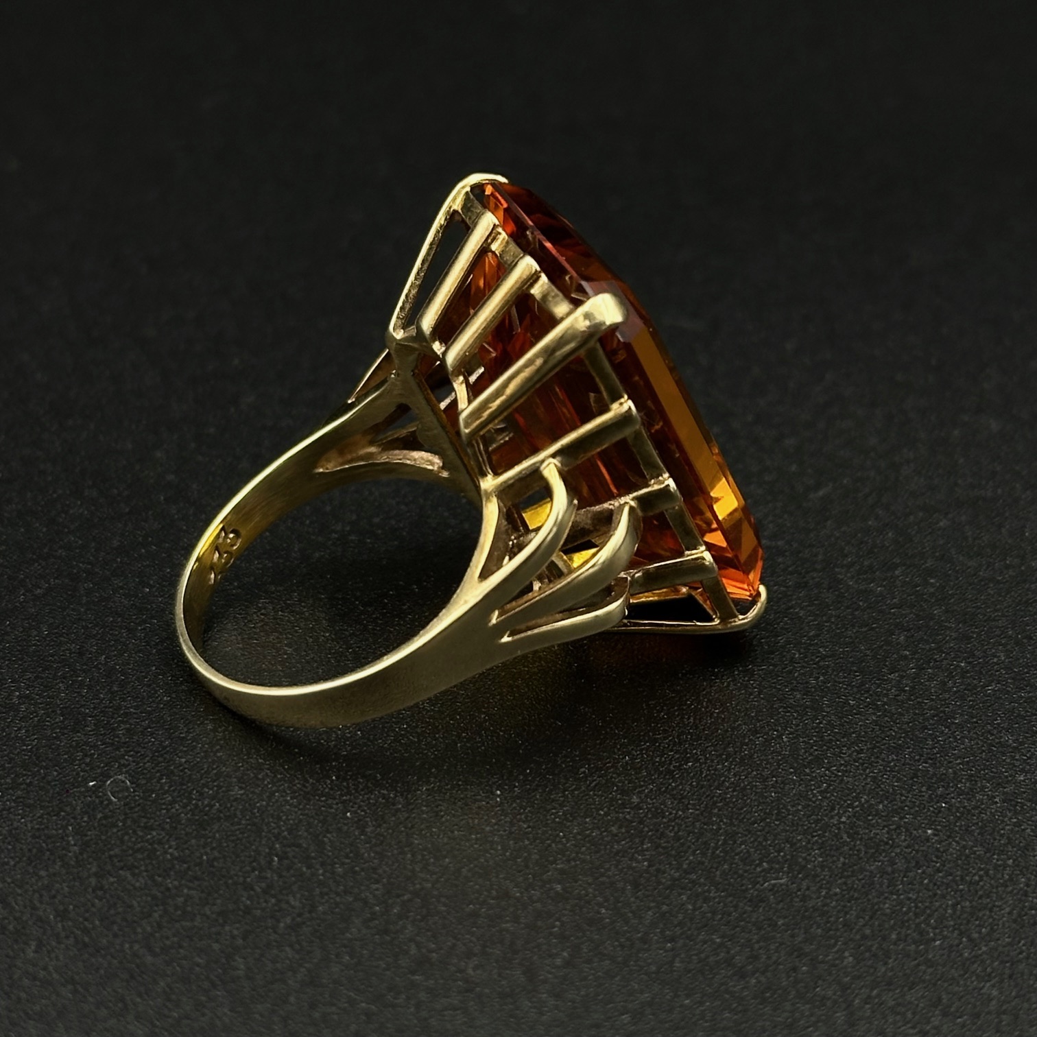 Auffälliger Ring aus 333er Gold mit einem beeindruckenden Citrin im ovalen Schliff. Der Stein misst ca. 2,5 x 1,8 cm und zieht mit seiner warmen, goldgelben Farbe alle Blicke auf sich.