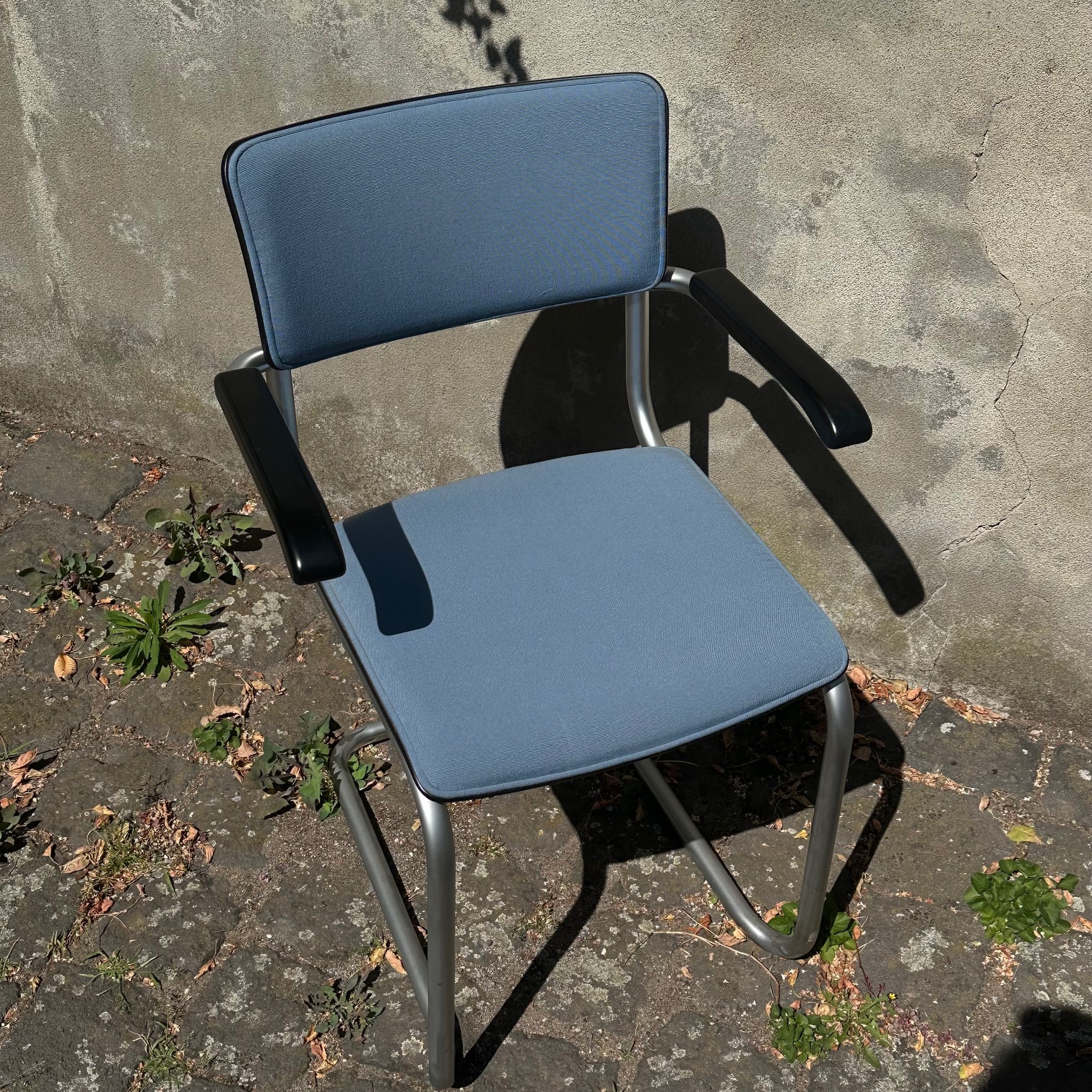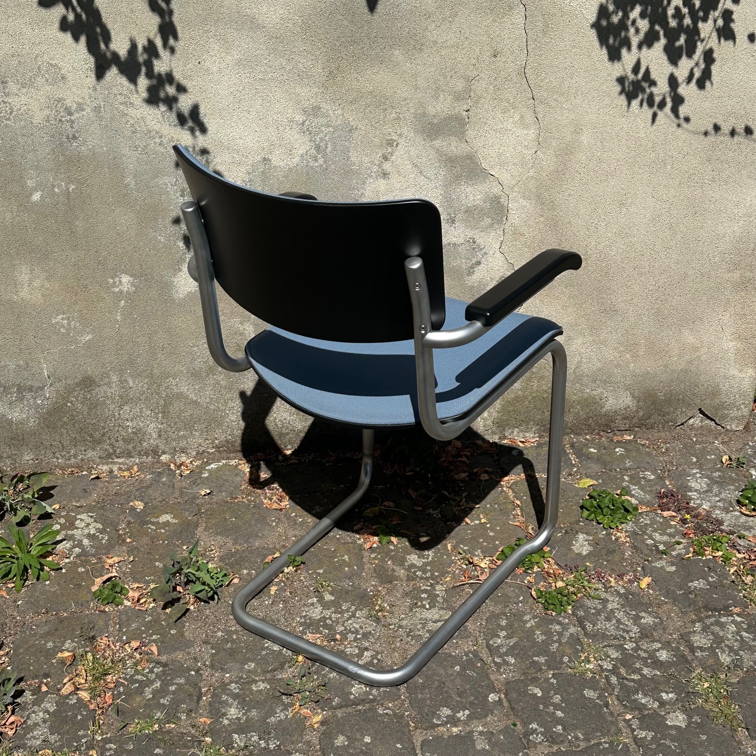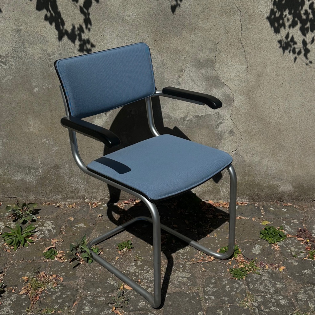Freischwinger von Thonet, Gestell lackiert, mit blauem Polster. Bauhaus-Klassiker nach dem Entwurf von Marcel Breuer (1929). Seltene Sonderausführung, ideal für Sammler und Designliebhaber.