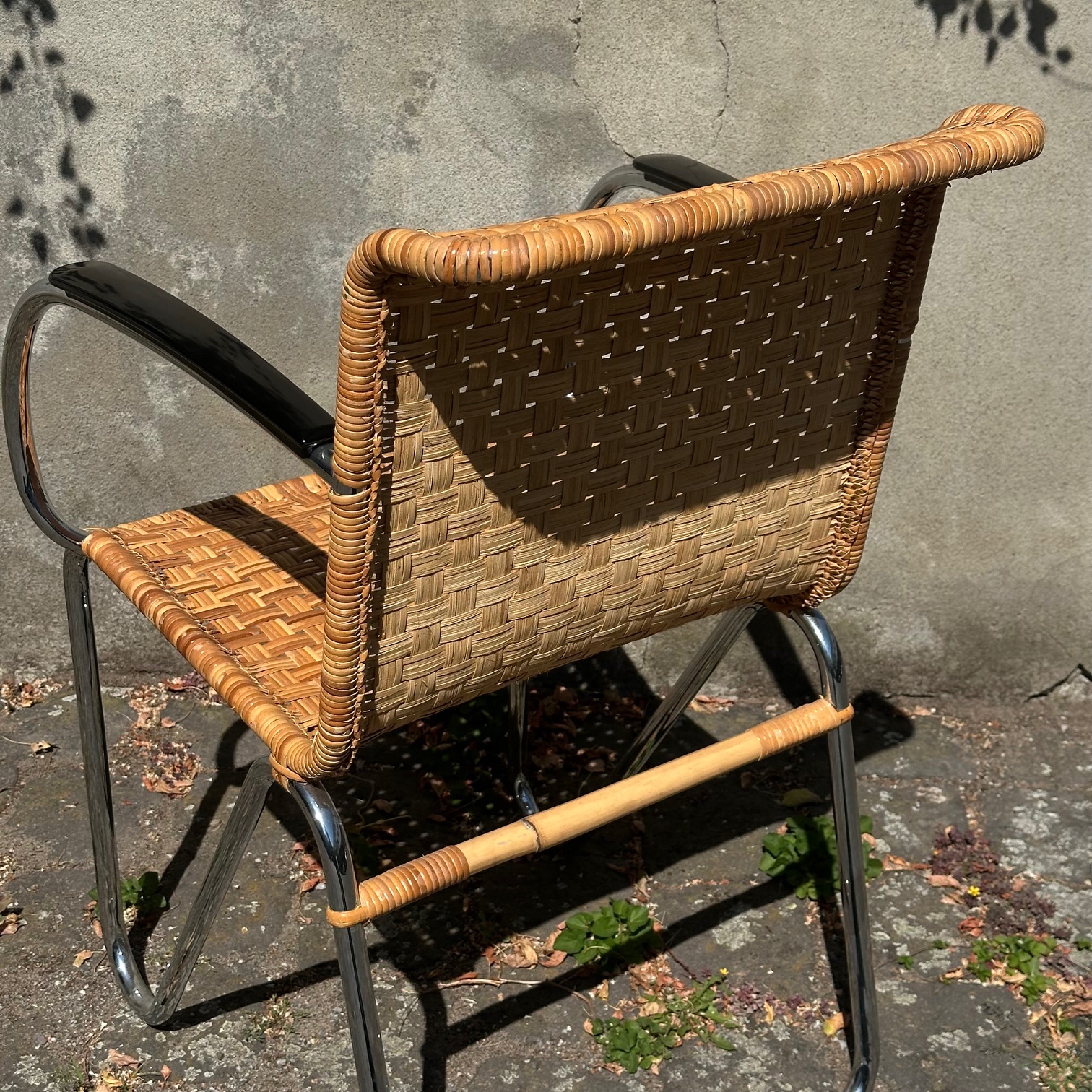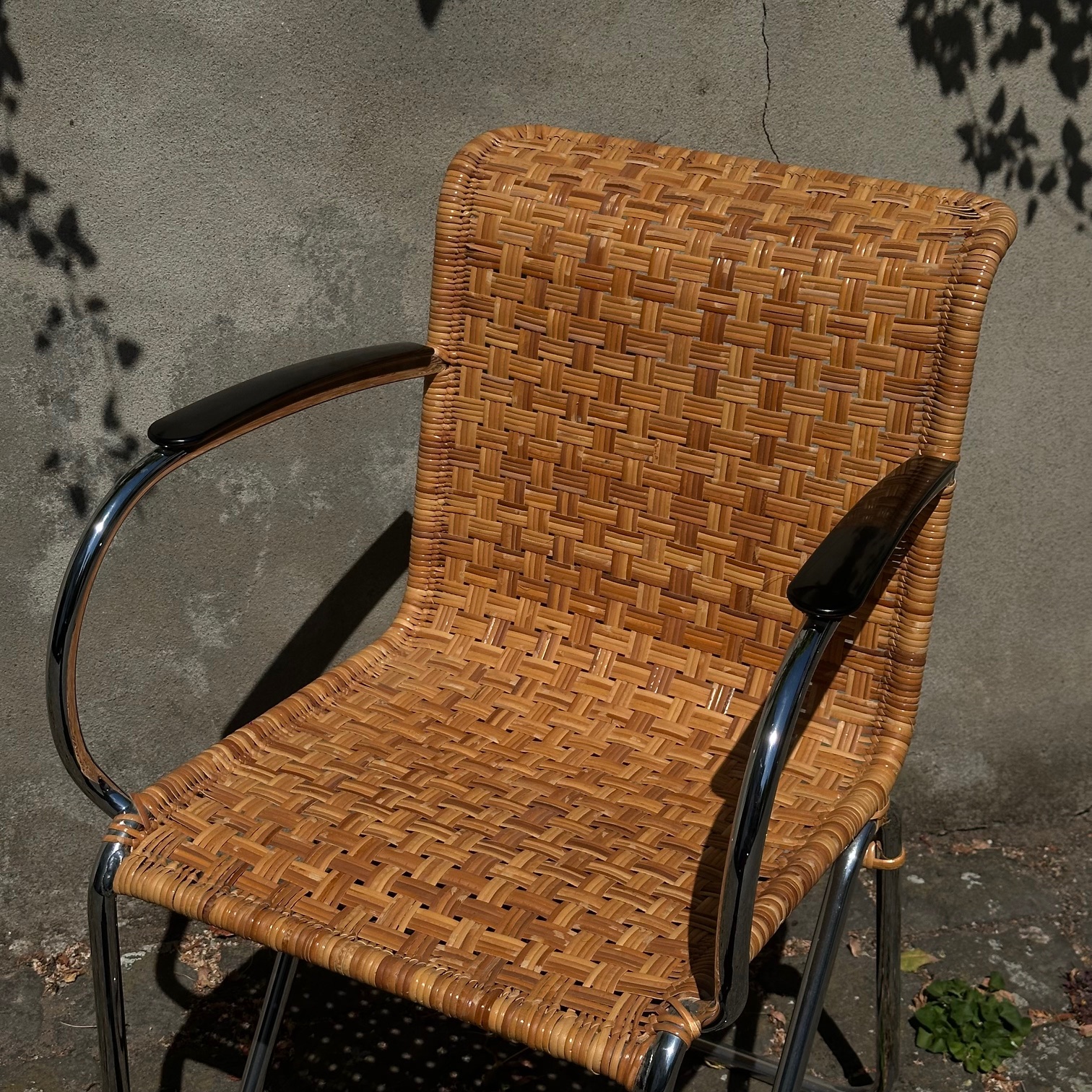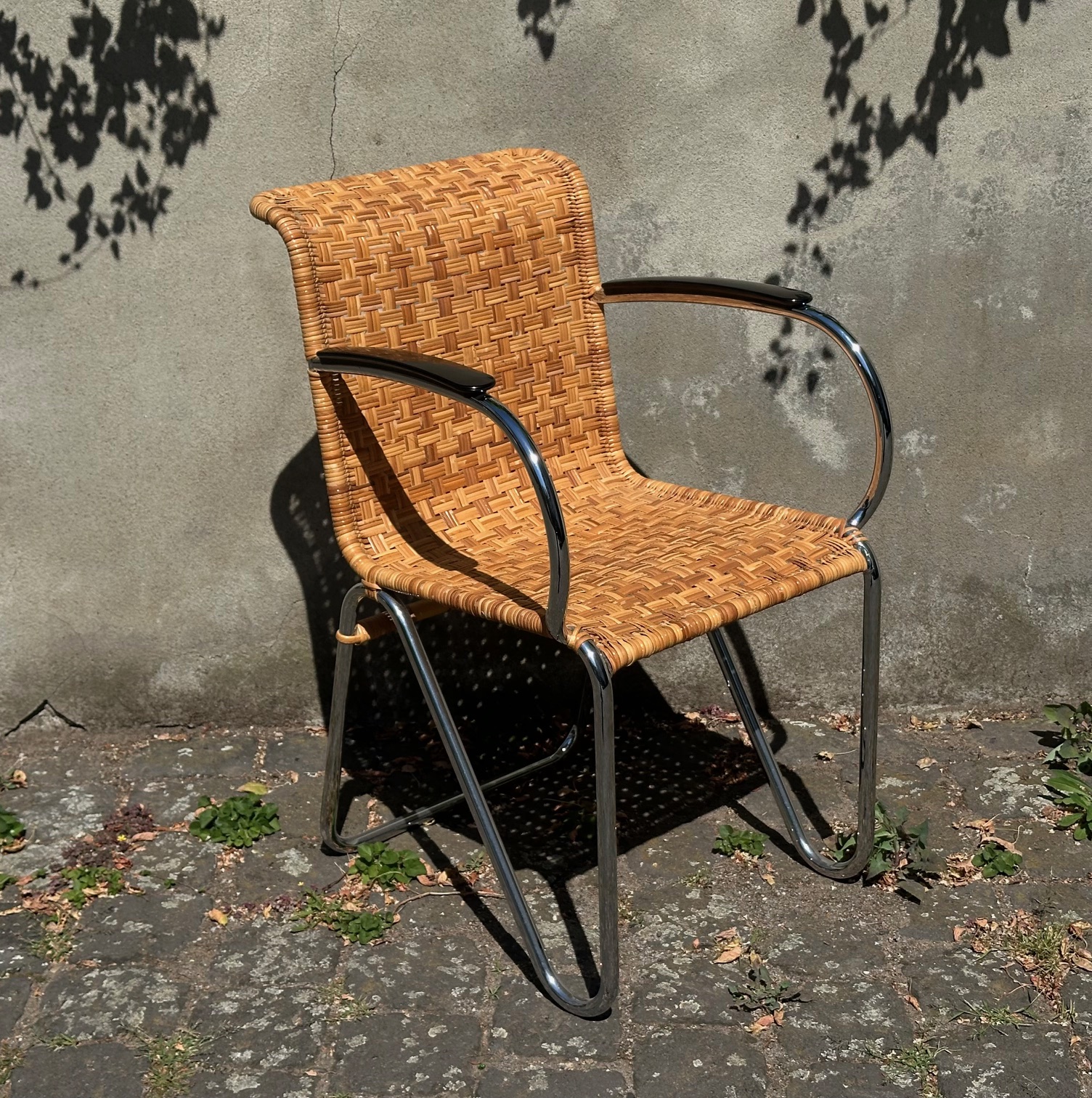 Eleganter Lounge-Sessel aus der klassischen Gispen-Serie, gefertigt in den 1950er–1970er Jahren. Sitzfläche aus handgefertigtem Korbflecht auf robustem Gestell, zeitloses ergonomisches Design. Guter Zustand, ein echtes Sammlerstück für Liebhaber hochwertiger Möbelklassiker.