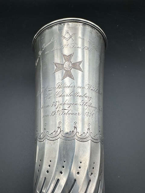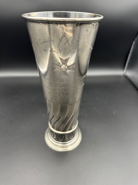 Der Pokal, war ein Geschenk an den Br. Grünberg zur Erinnerung an den 27. Juni 1867. Die Inschrift zeigt ein Malteserkreuz und den Hinweis :