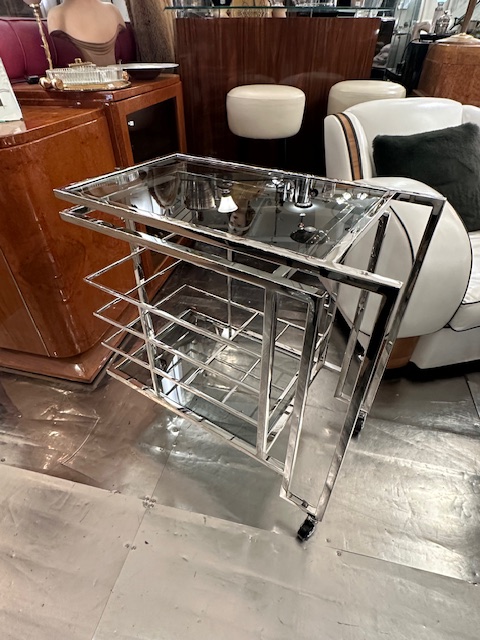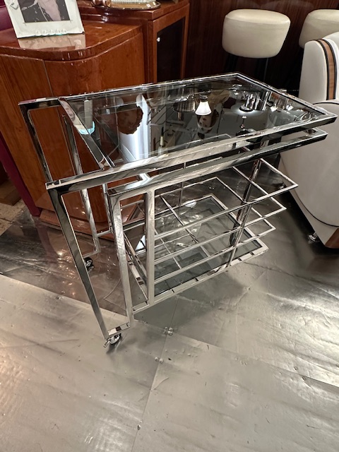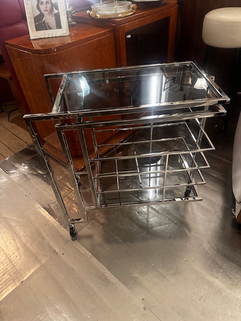 Schöner Barwagen, vernickelt, mit 2 Glasplatten und 6 Fächern (für Flaschen).