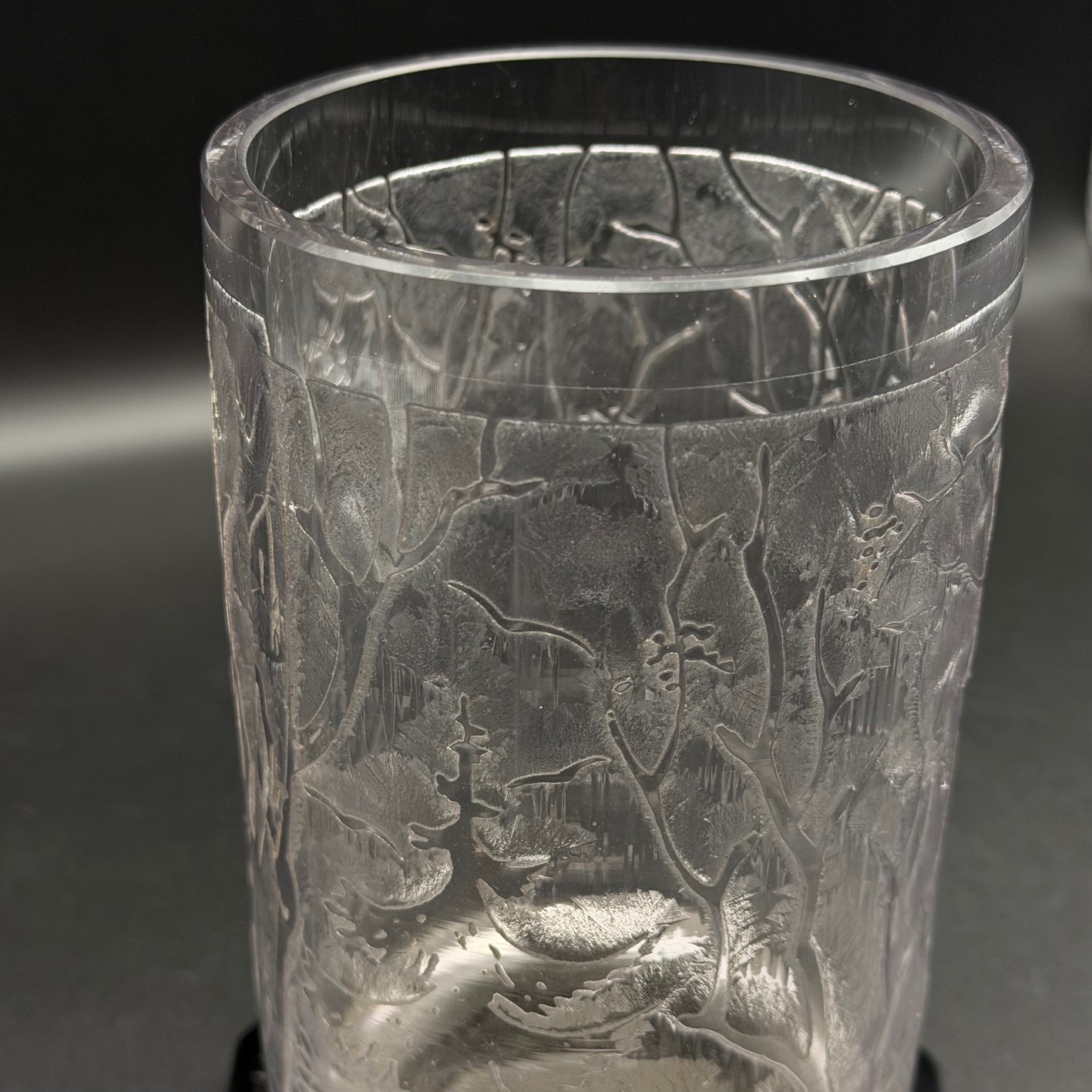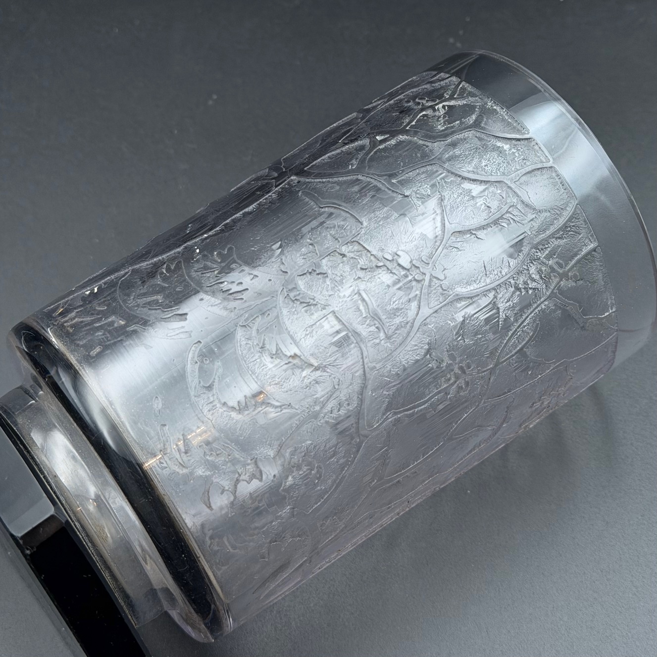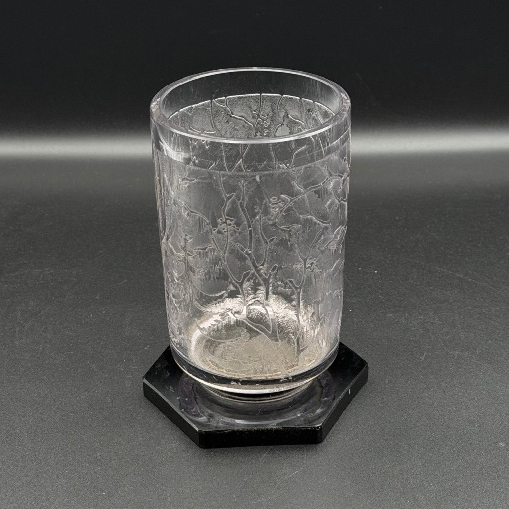 Kleine Art-Deco Vase signiert von Veramé mit feiner Verzierung, ruhend auf einem eleganten Sockel aus schwarzem Glas. Der obere Teil ist durchsichtig gearbeitet und setzt die dekorativen Details wirkungsvoll in Szene. Die klare Formensprache und der Materialkontrast verleihen der Vase eine zeitlose Eleganz ideal als stilvolles Sammlerstück oder dezenter Akzent in klassischen und modernen Interieurs.