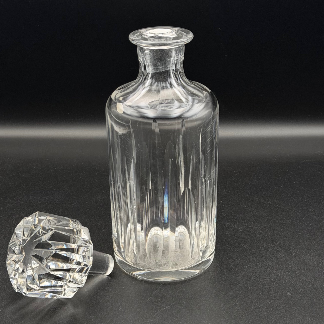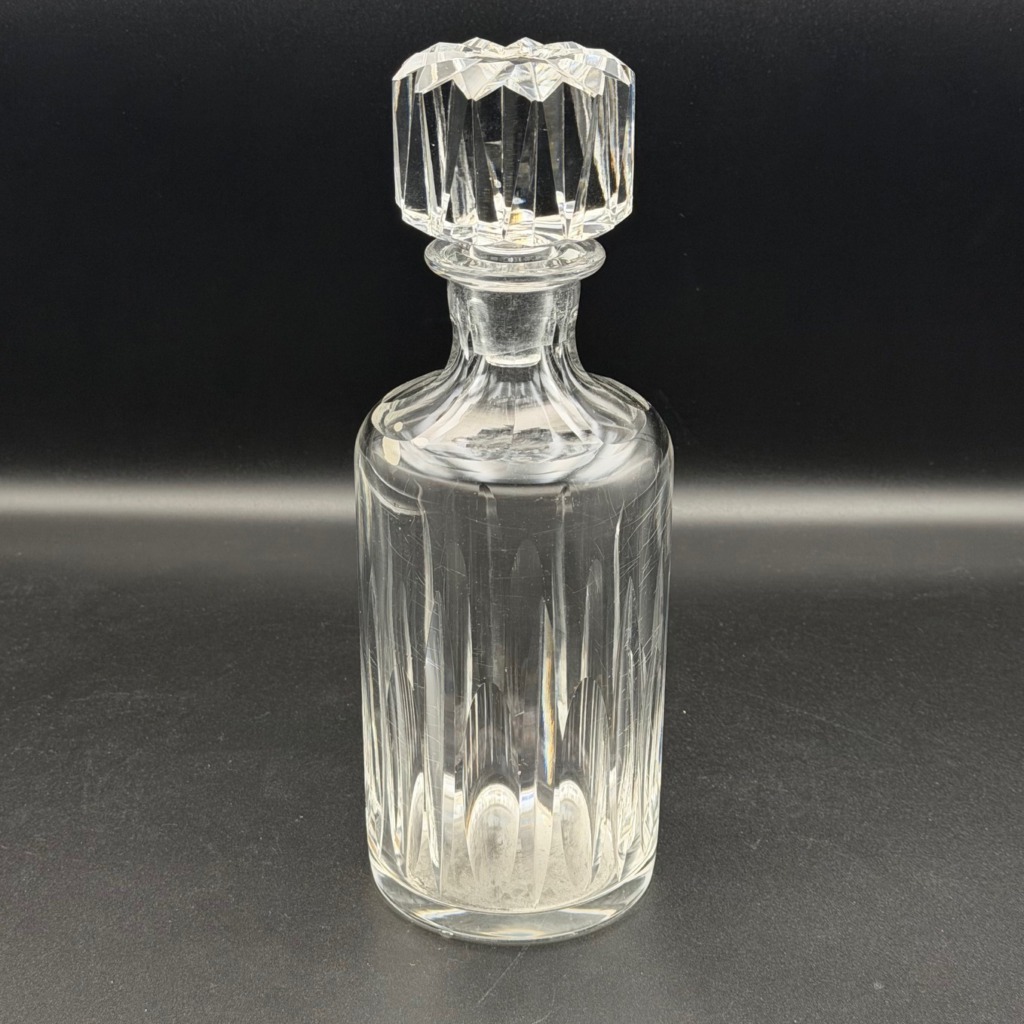 Elegante Art-Déco-Kristallkaraffe von Baccarat aus den 1920er Jahren mit originalem Verschluss. Die klare, geometrische Formensprache und der fein geschliffene Kristall spiegeln den typischen Stil der Epoche wider. Lichtreflexionen betonen die hochwertige Verarbeitung und verleihen der Karaffe eine zeitlose Eleganz. Ein stilvolles Sammlerstück sowie ein edler Akzent für Bar oder Tafel.