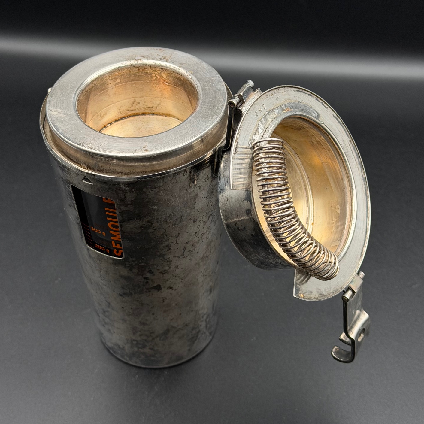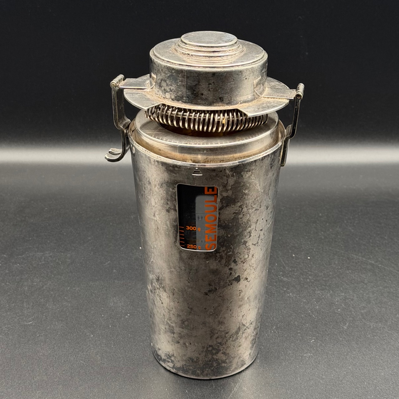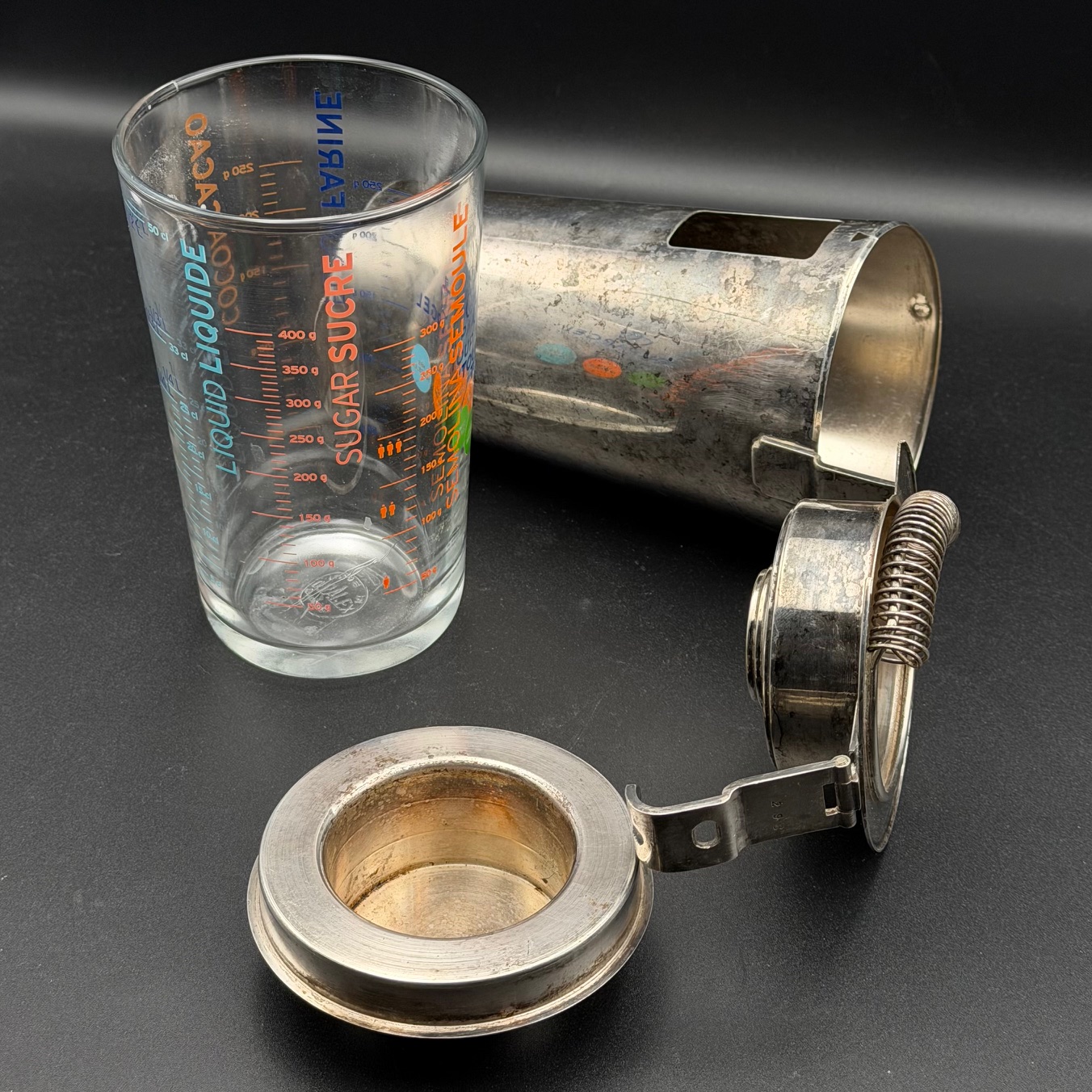 Cocktailshaker aus den 1930er Jahren mit zeittypischem Design. Der eingesetzte Glaseinsatz ist nicht original, fügt sich jedoch harmonisch in das Gesamtbild ein. Ein authentisches Baraccessoire mit Vintage-Charme, ideal für Sammler oder als stilvolles Objekt für eine klassische Hausbar.
