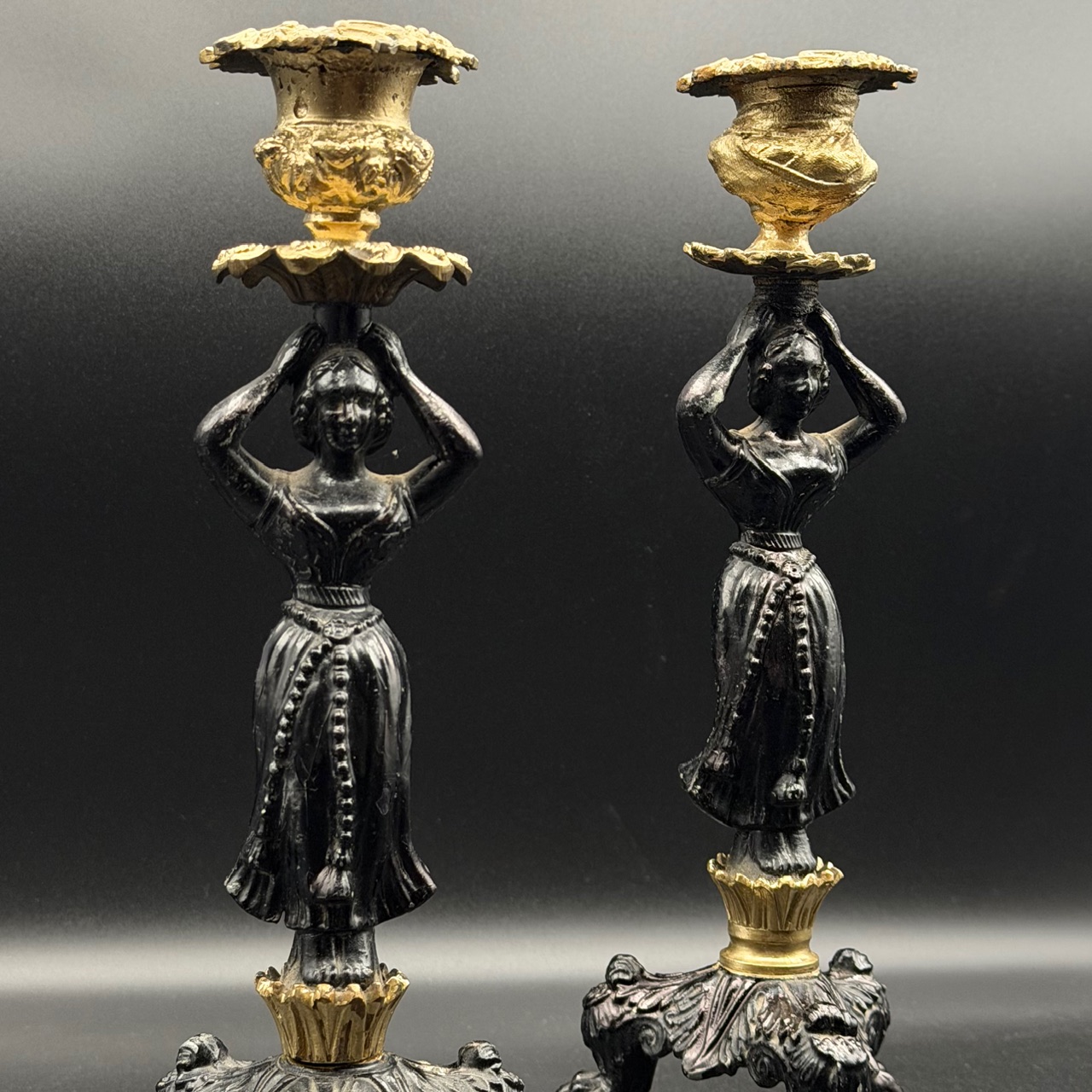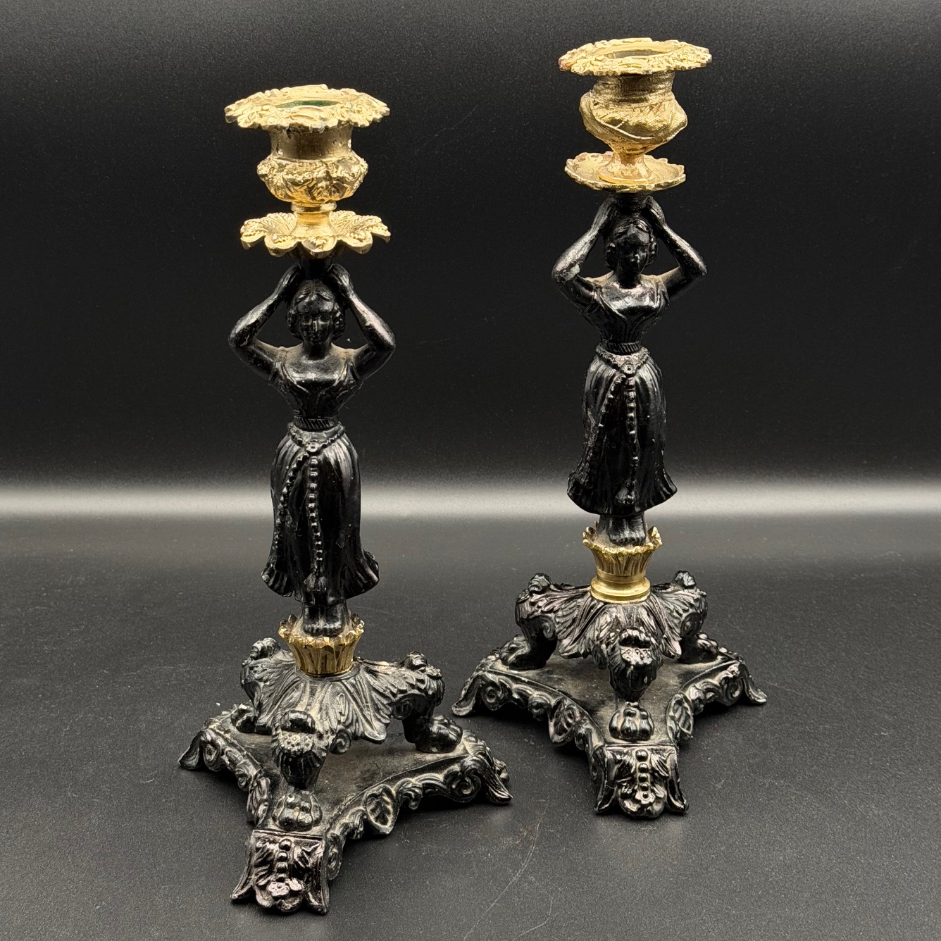 Zwei dekorative Kerzenleuchter mit figürlicher Gestaltung, gefertigt aus dunkel patiniertem Metall mit goldfarbenen Akzenten. Die schlanken Figuren tragen die Kerzenteller über dem Kopf und stehen auf reich ornamentierten Sockeln mit geschwungenen Füßen. Der Kontrast zwischen der dunklen Oberfläche und den vergoldeten Details verleiht den Leuchtern eine elegante, historische Ausstrahlung. Ein ausdrucksstarkes Paar, ideal als Blickfang für klassische oder eklektische Interieurs.