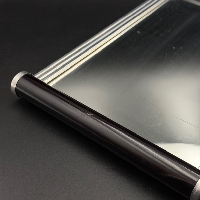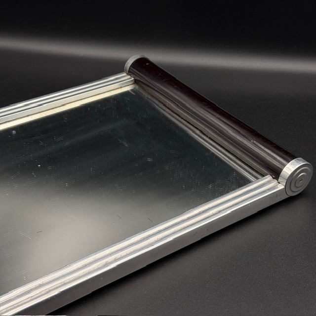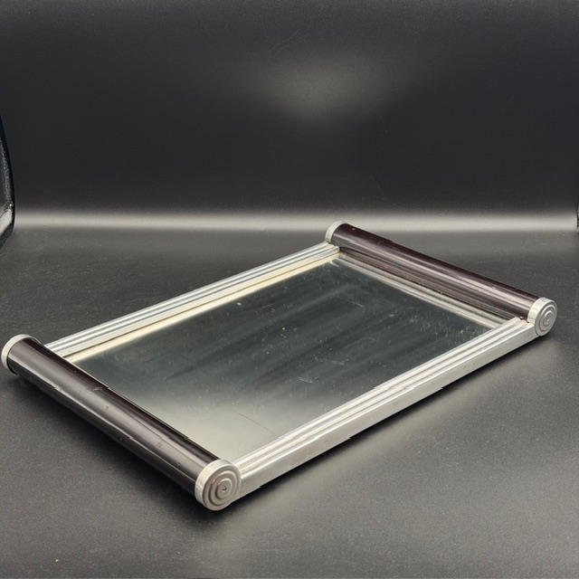 Dieses elegante Art-Déco-Tablett aus den 1930er Jahren verkörpert die zeitlose Ästhetik und den luxuriösen Charme dieser Epoche. Die klare, geometrische Formensprache wird durch eine edle Spiegelfläche unterstrichen, die dem Tablett eine besondere Tiefe und Lichtwirkung verleiht. Schwarze Griffe setzen einen markanten Kontrast und sorgen zugleich für eine sichere und komfortable Handhabung.