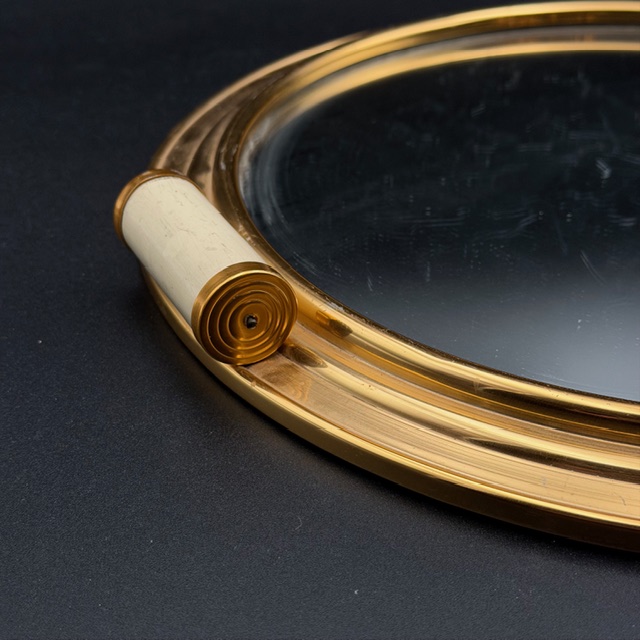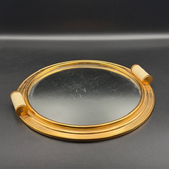 Dieses runde Art-Déco Tablett aus den 1930er Jahren besticht durch seine harmonische Form und die hochwertige Ausführung. Die spiegelnde Fläche verleiht dem Tablett eine edle, lichtreflektierende Wirkung und unterstreicht den glamourösen Charakter der Epoche. Die goldfarbene Hardware bildet einen luxuriösen Akzent und ergänzt sich stilvoll mit den zwei seitlichen Griffen, die sowohl funktional als auch dekorativ sind.