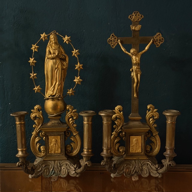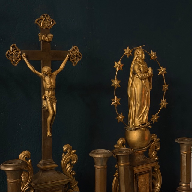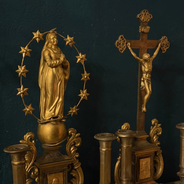 Dieses außergewöhnliche Paar reich verzierter Kerzenständer stammt aus der Zeit um 1880 und ist der sakralen Kunst des späten 19. Jahrhunderts zuzuordnen. Die Ausführung zeugt von hoher handwerklicher Qualität und einer starken religiösen Symbolik, wie sie für kirchliche oder private Andachtsräume dieser Epoche typisch war.