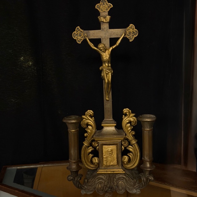 Der zweite Kerzenständer trägt ein detailliert gearbeitetes Kruzifix mit der Figur Christi, dessen Proportionen und Körpersprache eine ausdrucksstarke, leidvolle Darstellung vermitteln. Das Kreuz ist mit dekorativen Enden versehen, die den ornamentalen Charakter des Ensembles verstärken.