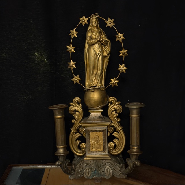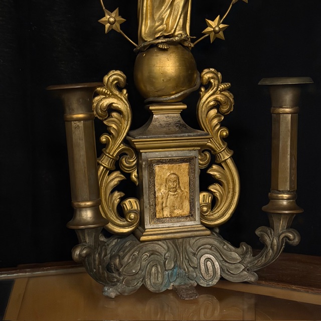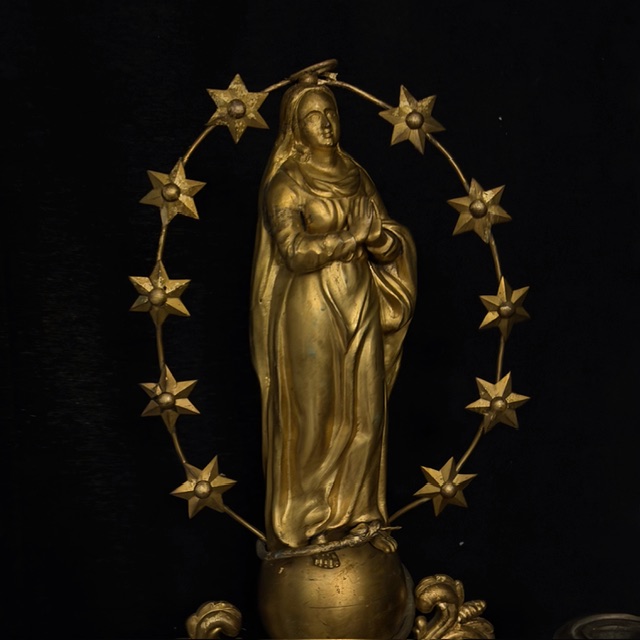 Der eine zeigt eine fein modellierte Marienfigur, stehend auf einer Weltkugel, umgeben von einem filigranen Sternenkranz, ein klassisches Motiv der „Unbefleckten Empfängnis“. Die Darstellung wirkt ruhig, würdevoll und ausgewogen, mit sorgfältig ausgearbeiteten Gesichtszügen und Gewandfalten.