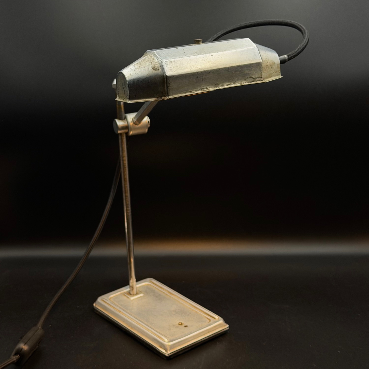 Diese außergewöhnliche Tischleuchte aus den 1920er Jahren stammt von Pirouette France und ist signiert ein authentisches Sammlerstück aus der Zeit des frühen Art Déco. Der Korpus besteht aus Messing mit vernickelter Oberfläche, die der Leuchte ihren edlen, zeitlosen Glanz verleiht.