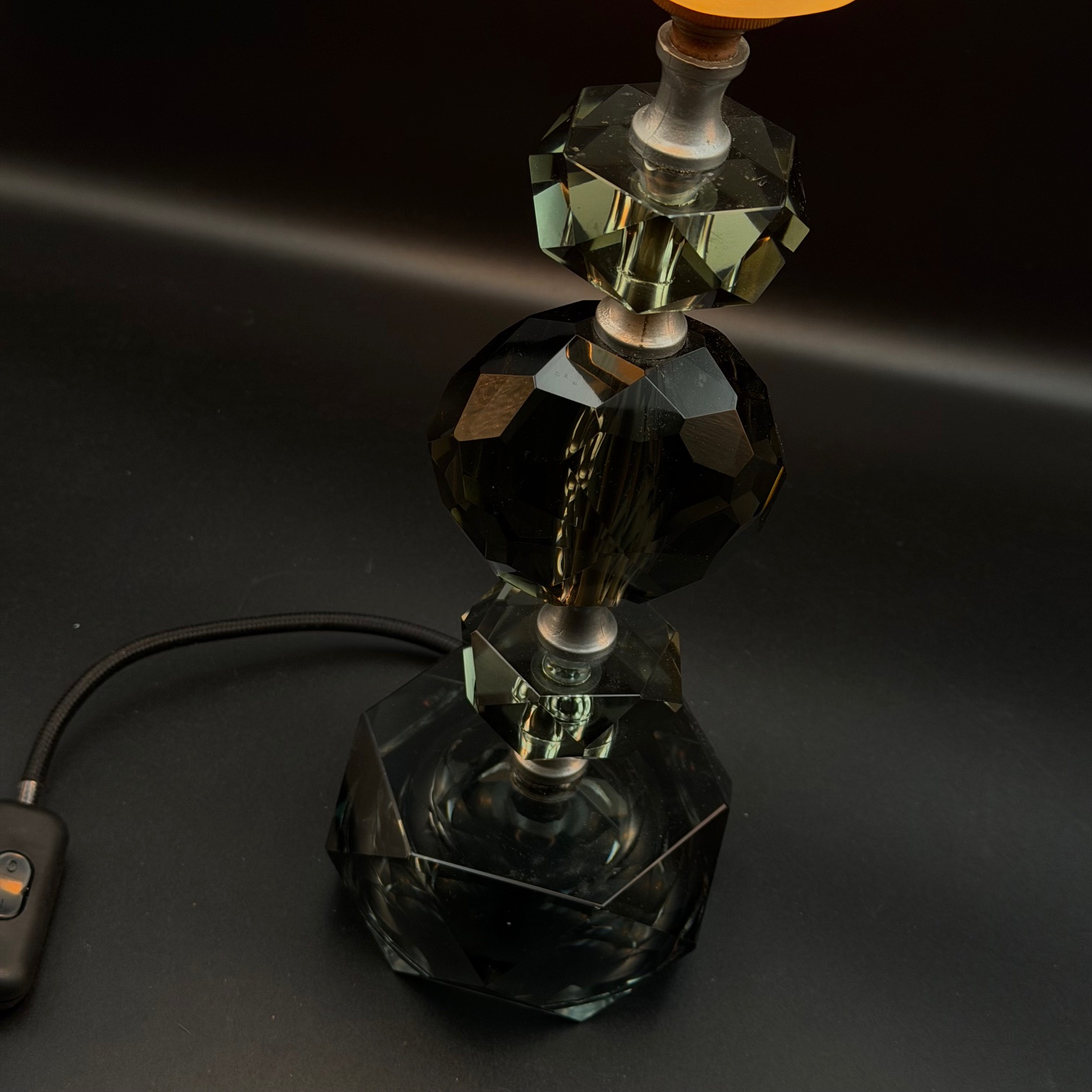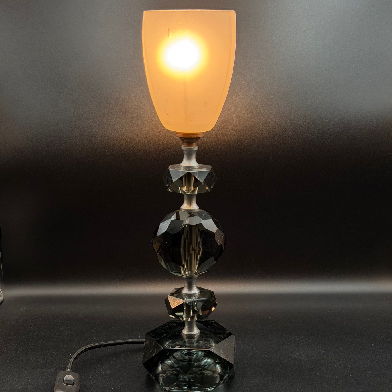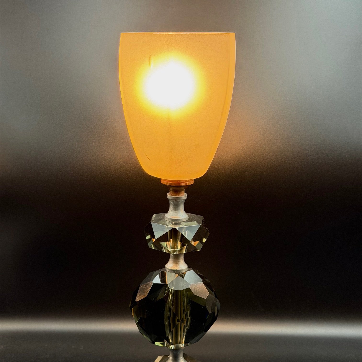 Diese stilvolle Art-Deco-Tischlampe aus den 1920er Jahren besticht durch ihre geometrischen Formen und die Kombination aus klarem und leicht grünem Glas. Die Basis ist mit gestapelten Glas- und Kristallelementen in markanten, symmetrischen Formen gestaltet, die einen eleganten und zeitlosen Look erzeugen. Der Lampenschirm aus mattem Glas sorgt für ein weiches, warmes Licht, das den Glamour und die Ästhetik des Art-Deco-Stils perfekt unterstreicht. Ein echtes Sammlerstück für Liebhaber von Vintage-Designs und hochwertigem Handwerk.