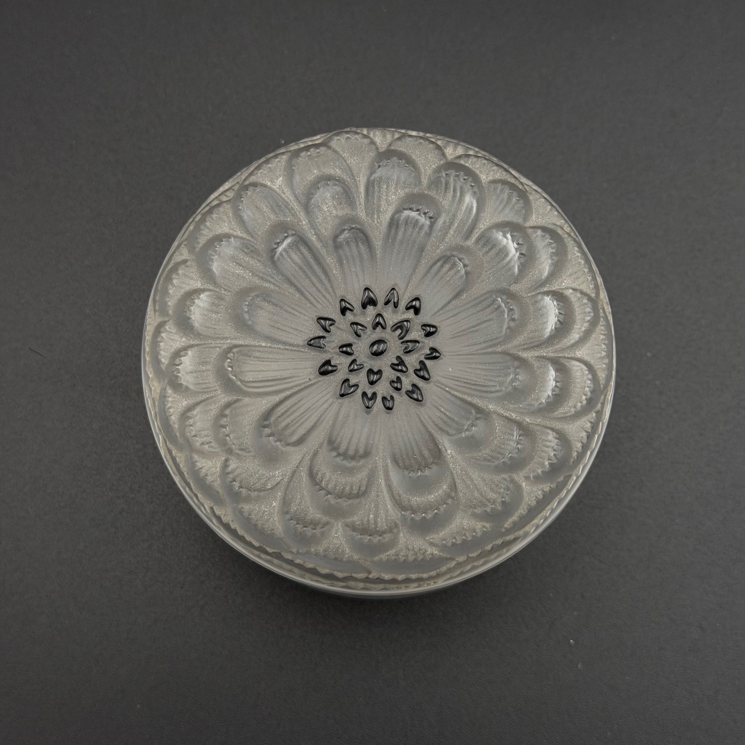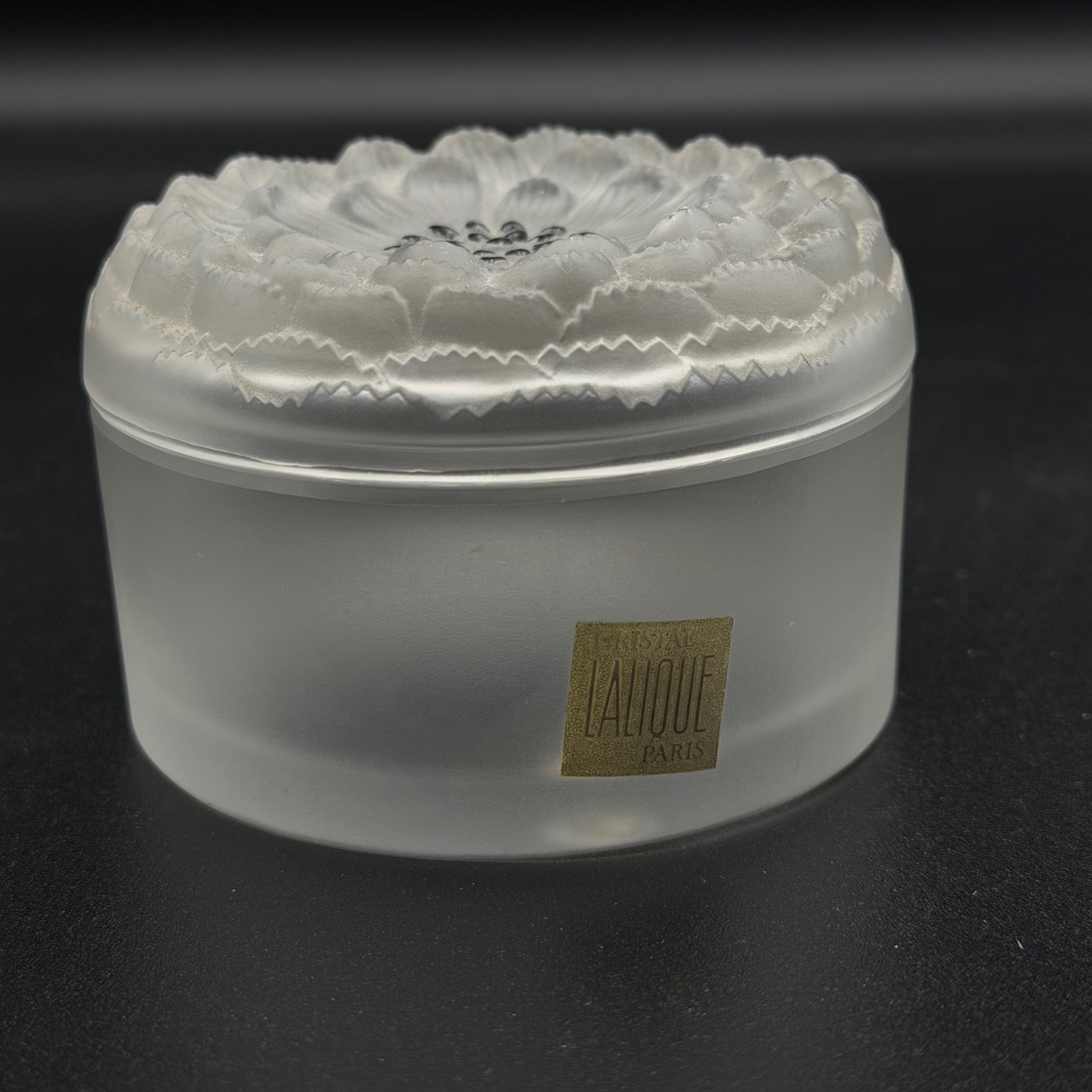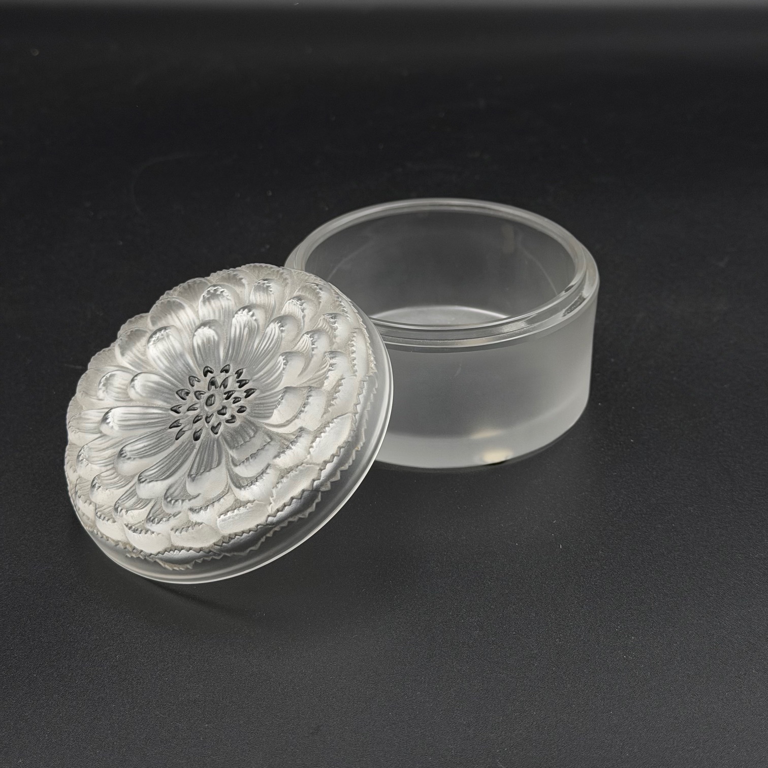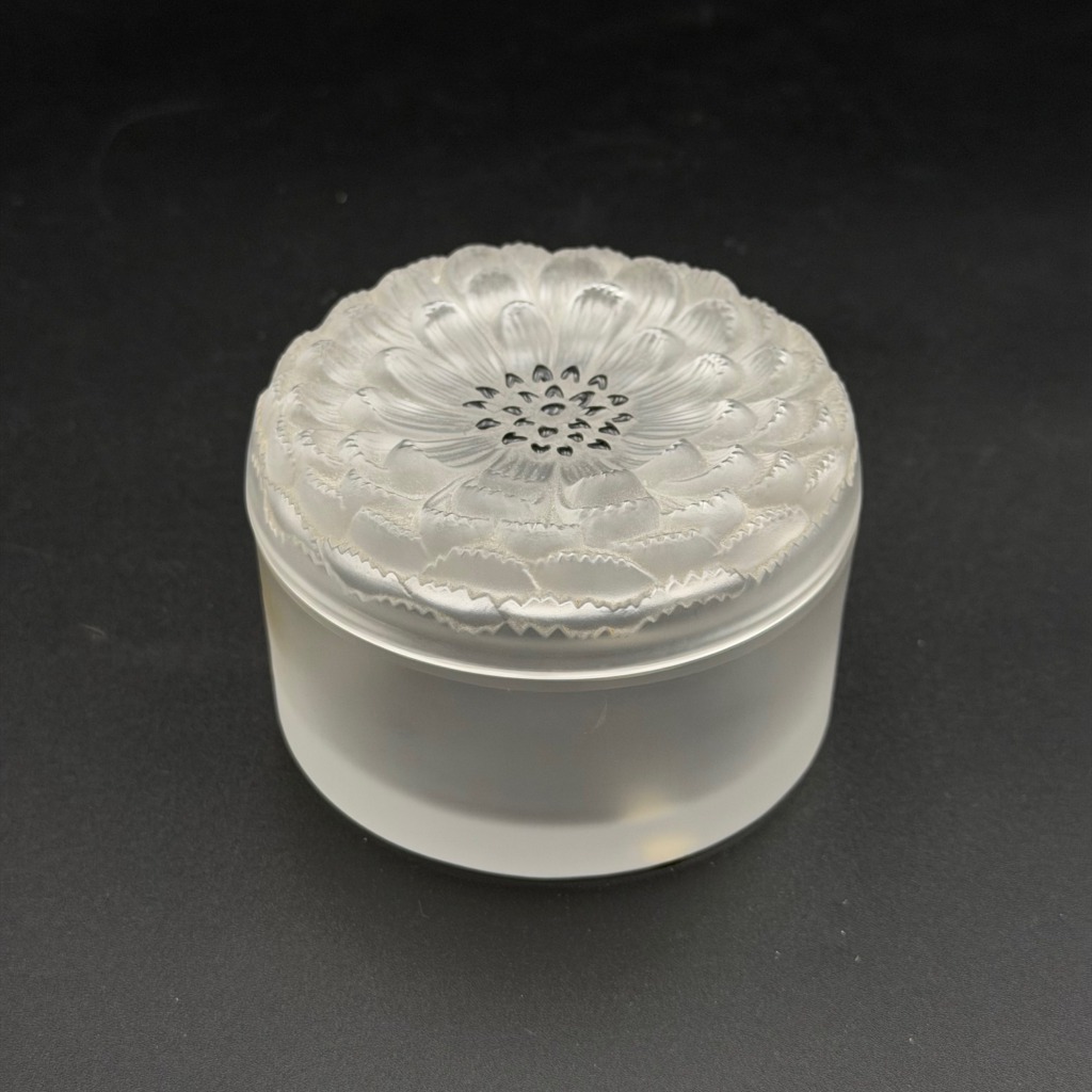 Elegante kleine Kristalldose signiert von Lalique, gefertigt in den 1980er Jahren. Die Dose besticht durch ihre hochwertige Verarbeitung und das typische Lalique-Design: Im Deckel ist eine fein ausgearbeitete Blume integriert.
