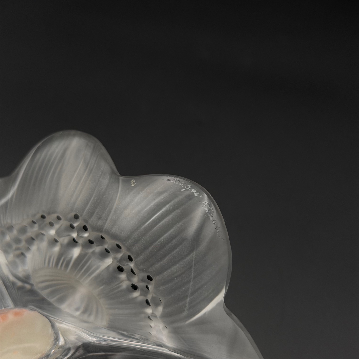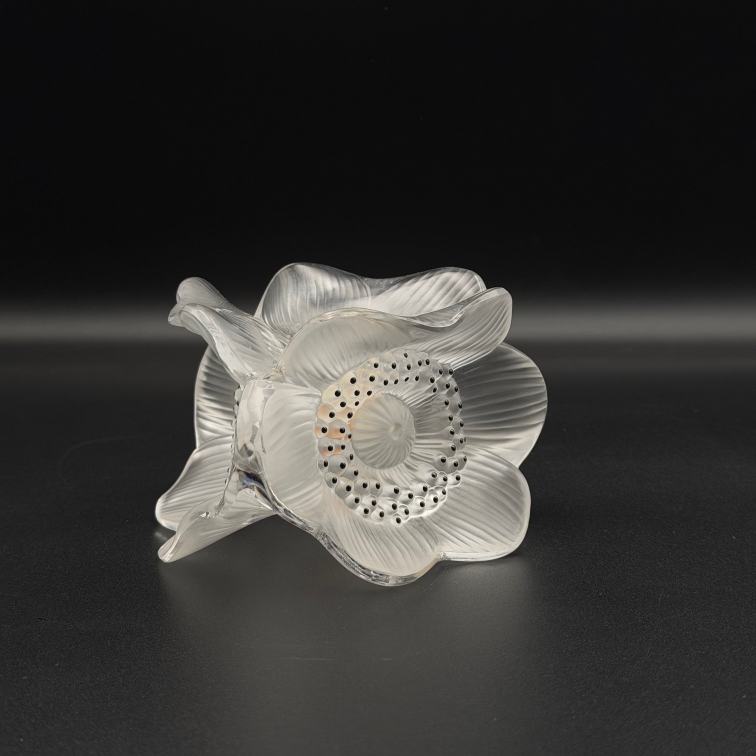 Eleganter Kerzenständer aus klarem Lalique-Kristall, gefertigt in den 1980er Jahren und signiert. Der Kerzenhalter ist als plastische Blüte gestaltet: fein gerippte Blütenblätter umgeben die Kerzenaufnahme, während das detailreich ausgearbeitete Blütenzentrum mit matten und klaren Partien einen besonders schönen Licht- und Tiefeneffekt erzeugt.