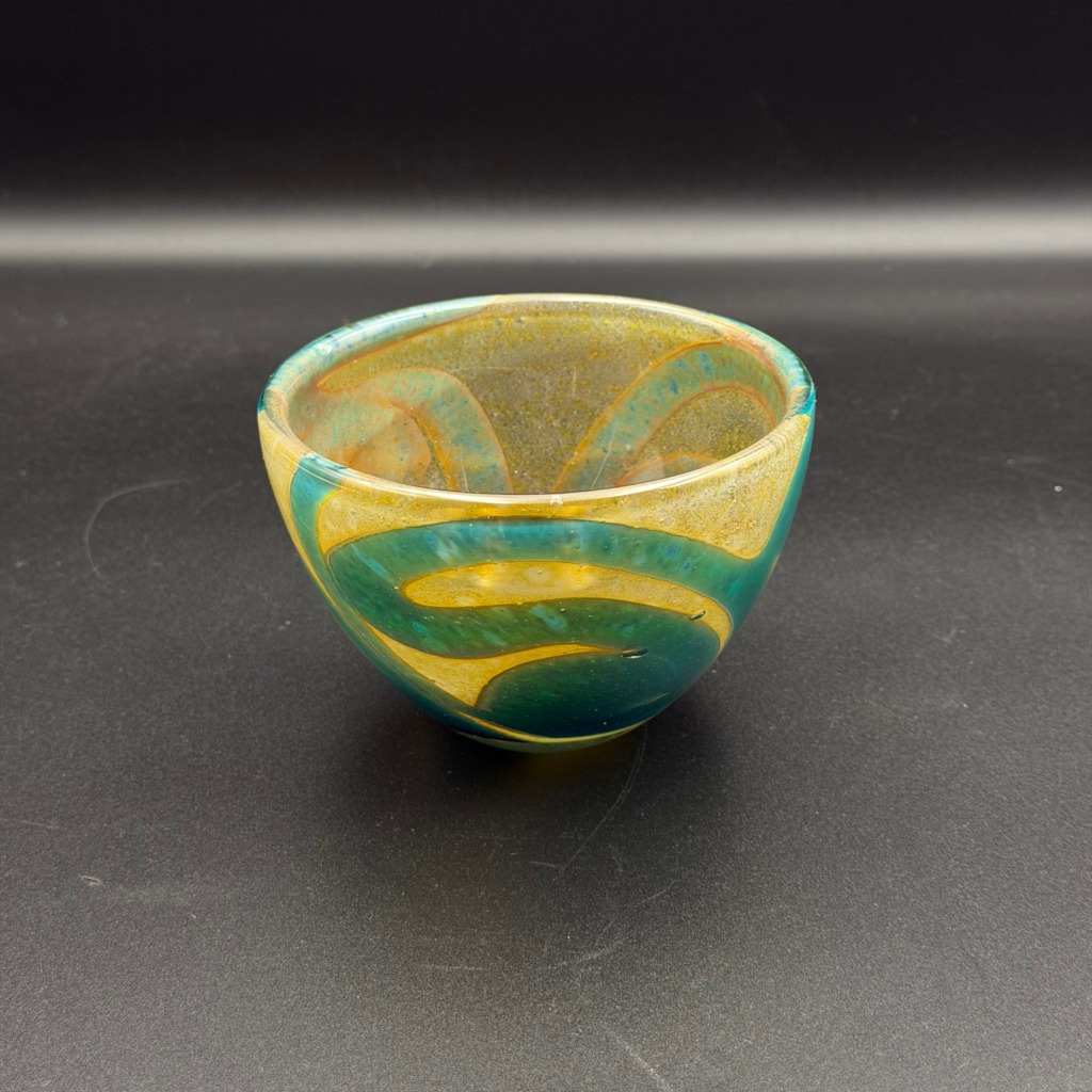 Handgefertigte Glasschale aus der Manufaktur Mdina Glass (Malta) aus den 1980er Jahren. Das Stück zeigt die für Mdina typische, ausdrucksstarke Farbgestaltung in Blau und Gelb, die weich ineinander übergeht und dem Glas eine besondere Tiefe verleiht.