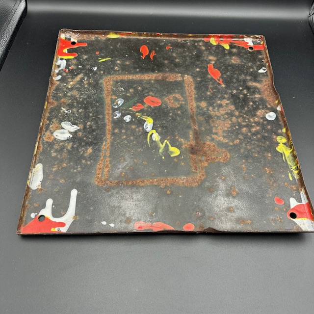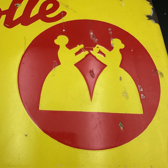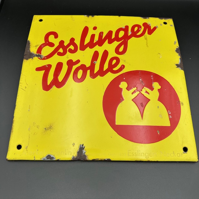 Emailleschild „Esslinger Wolle“ aus den 1930-1950er Jahren im Quadrat. Zustand: kleine Abplatzer und Verrostungen.