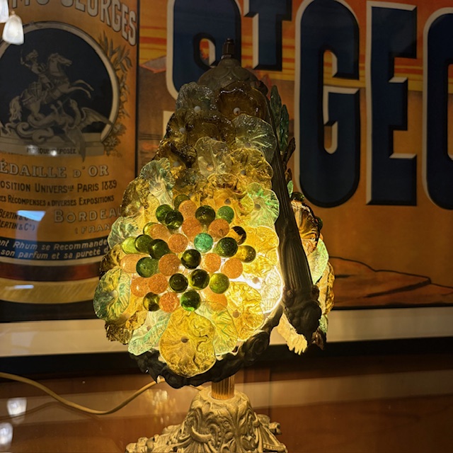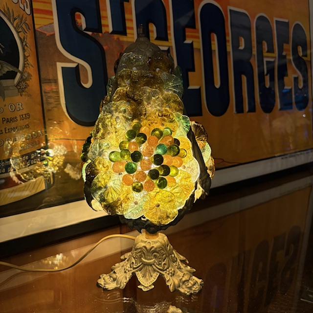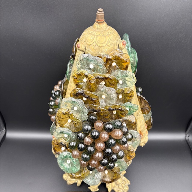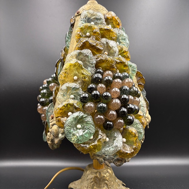 Diese außergewöhnliche Vintage Tischlampe ist ein echter Blickfang für stilvolle Wohnräume. Der aufwendig gestaltete Lampenschirm besteht aus dekorativen Glasblüten, Blättern und Trauben-Elementen in warmen Gold-, Bernstein-, Grün- und Brauntönen. Durch die strukturierte Oberfläche entsteht ein besonders stimmungsvolles, warmes Licht, das jedem Raum eine elegante Atmosphäre verleiht.