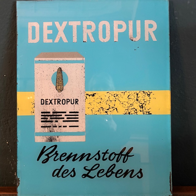 DEXTROPUR Glaswerbeschild aus den 1950-1960er Jahren. Von der Firma Werndl, aus Ulm, das Schild ist handbemalt und hat folgende Maße: